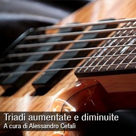 Come potete notare nei tre esempi, la diteggiatura della triade e dei suoi rivolti è sempre la stessa ed ogni gruppo di tre note dista una terza maggiore dall’altro; questa è una caratteristica che, su uno strumento come il basso elettrico, facilita molto lo studio e le memorizzazione della triade dal punto di vista geometrico.Come ribadisco spesso però, anche in questo caso bisogna impegnarsi a pensare alle note senza affidarsi troppo alle geometrie che, seppur di aiuto, possono diventare una gabbia da cui diventa poi difficile uscire.La triade aumentata può essere utilizzata su tutti gli accordi maggiori con quinta eccedente (#5); può però anche essere utilizzata sugli accordi di 7(b13), in cui il suono della quinta aumentata corrisponde al suono di quella che in realtà è la sesta minore; provate a suonarla sulle cadenze V7(b9b13)-Im7 per saggiarne l’efficacia.Passiamo all’analisi della triade diminuita; come detto in precedenza possiamo costruire questa triade sovrapponendo due intervalli di terza minore, vediamo un esempio in C: