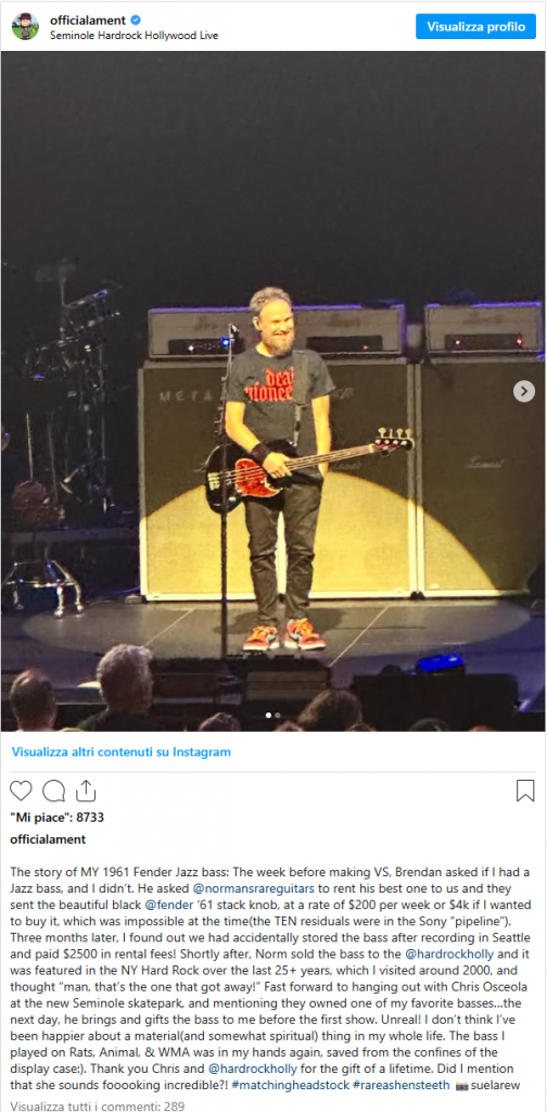 Un Fender Jazz Bass del 1961, protagonista nella registrazione di uno degli album più rappresentativi dei Pearl Jam, Vs.,è tornato nelle mani di Jeff Ament, oltre trent’anni dopo essere stato suonato per l’ultima volta in studio.