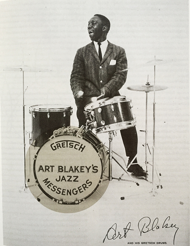 Saldamente associato al marchio Gretsch sin dagli anni Cinquanta, Blakey utilizzava di preferenza un modello Broadkaster ‘Progressive Jazz’ con cassa da 20″, rullante in legno da 14″ x 5,5″, rack tom da 12″ x 8″ e floor tom da 14″ x 14″.