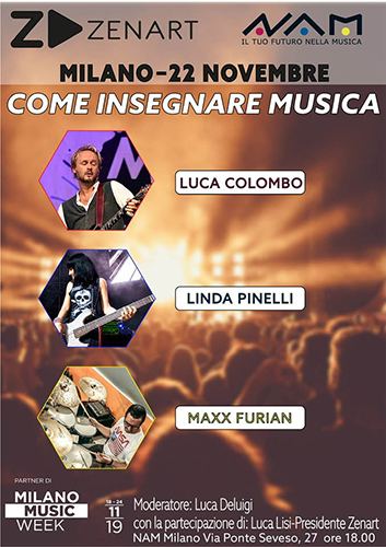Per la Milano Music Week l’agenzia Zenart presenta venerdì 22 novembre alla NAM di Milano (via Ponte Seveso 27) alle 18:00 l’incontro “Come insegnare musica”, con il chitarrista Luca Colombo, la bassista Linda Pinelli e il batterista Maxx Furian.