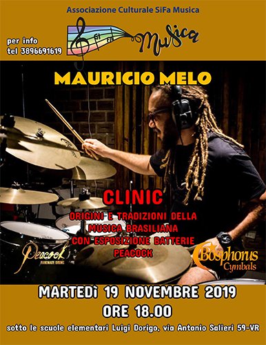 Martedì 19 novembre dalle 18:00, drum clinic sulle origini e le tradizioni della musica brasiliana con il batterista Mauricio Melo; a margine del seminario sarà possibile apprezzare un’esposizione di batterie artigianali Peacock, realizzate a Verona.