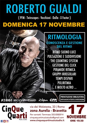 Ancora domenica 17 alle 15:30 i batteristi romani avranno finalmente la possibilità di assistere a “Ritmologia”, la master class di Roberto Gualdi (PFM, Vecchioni, Dalla, X Factor, Twinscapes). Conoscenza e gestione del ritmo il tema dell’incontro, in cui si parlerà, tra l’altro, di gestione del click, pulsazioni e suddivisioni, gruppi irregolari, tempi dispari, poliritmia…