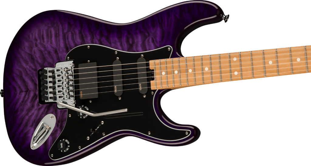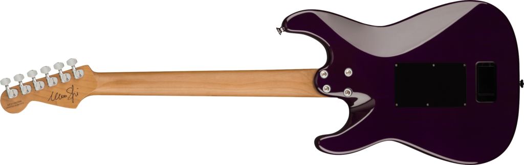 La Marco Sfogli Signature Pro-Mod So-Cal Style 1 HSS FR CM QM è verniciata in Transparent Purple Burst con battipenna nero e l’estetica viene completata dalle manopole nere in stile Strat, dall’hardware cromato e dalla paletta con licenza Fender Strat.