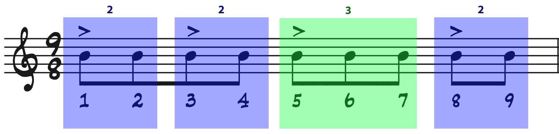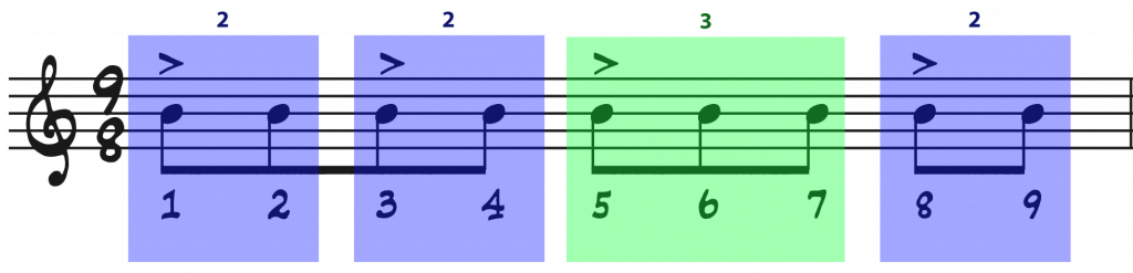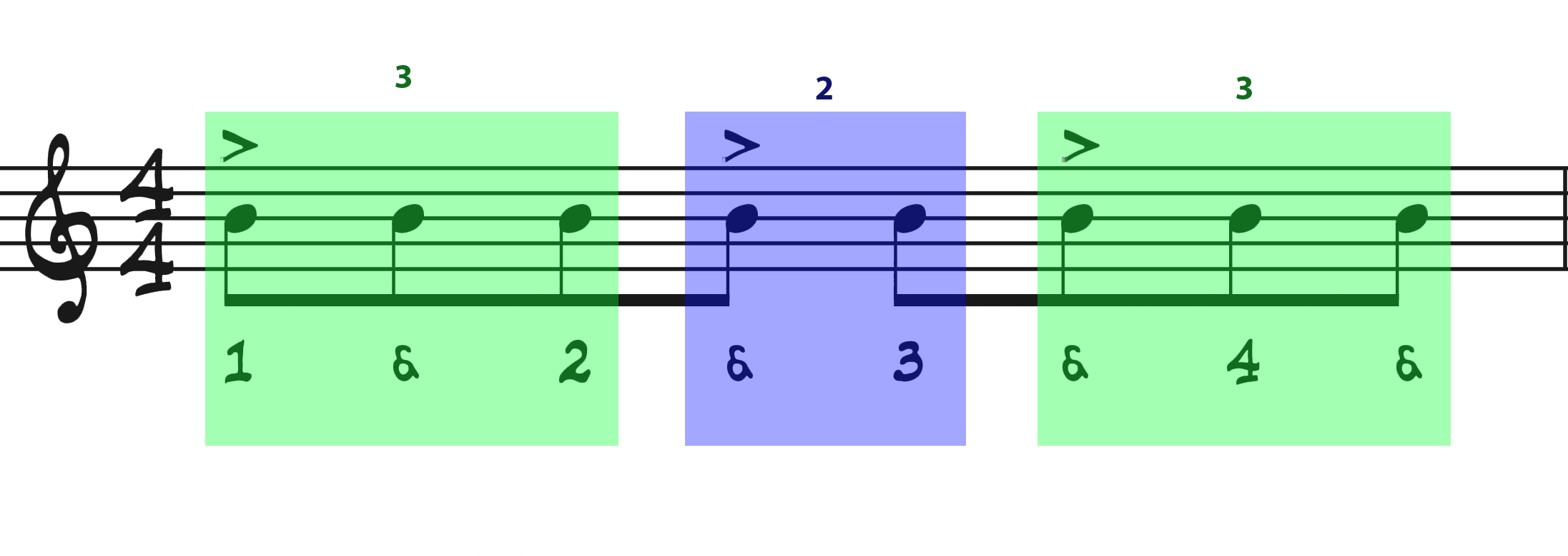 Se invece di pensare alla battuta come gruppi di 2 ottavi che si ripetono (quindi 2 + 2 + 2 + 2) iniziassimo a pensare a questa stessa battuta come gruppi differenti di ottavi, ad esempio 3 + 2 + 3?