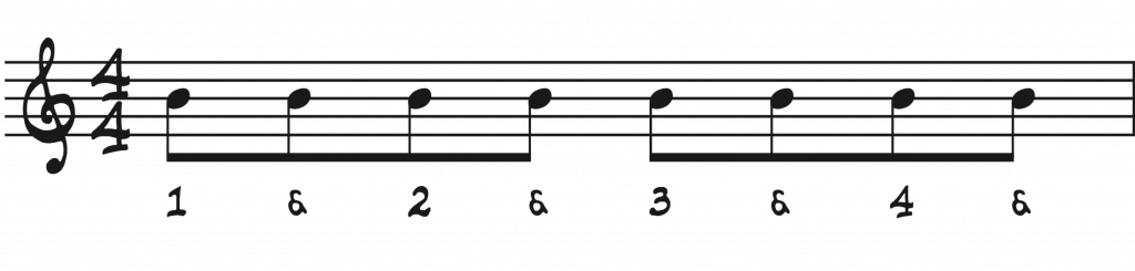 In un brano ordinario, gli ottavi andrebbero raggruppati a gruppi di due dato che siamo in 4/4, dando l’accento su ogni quarto in questo modo: