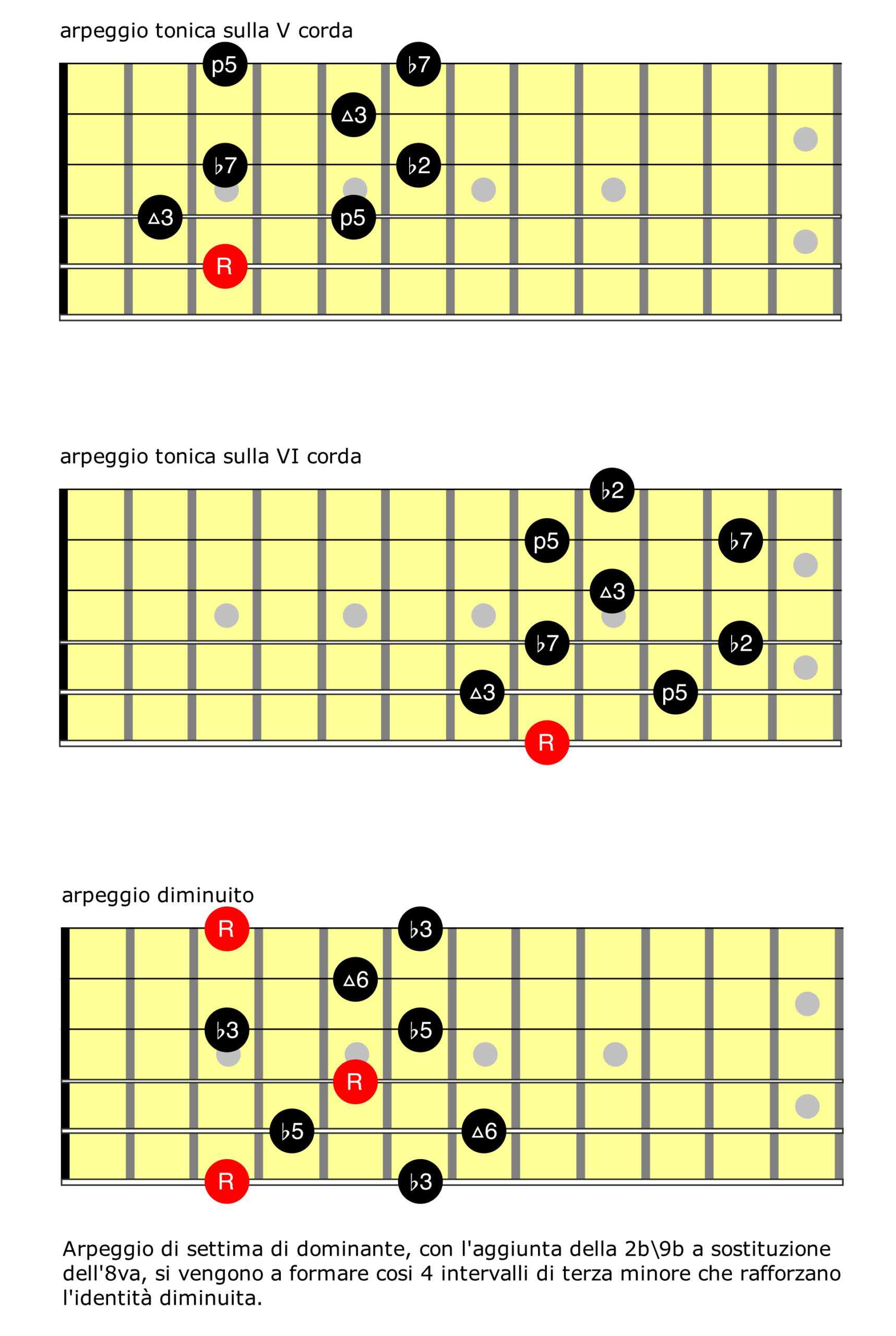 Potremo sintetizzare questa scala con l’arpeggio dell’accordo di settima di dominante con il V grado alterato: