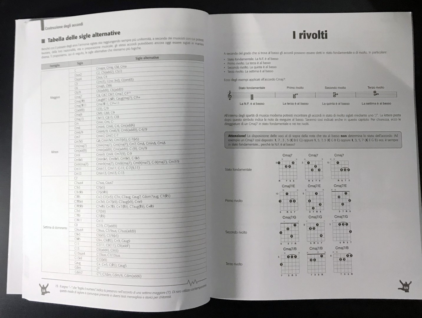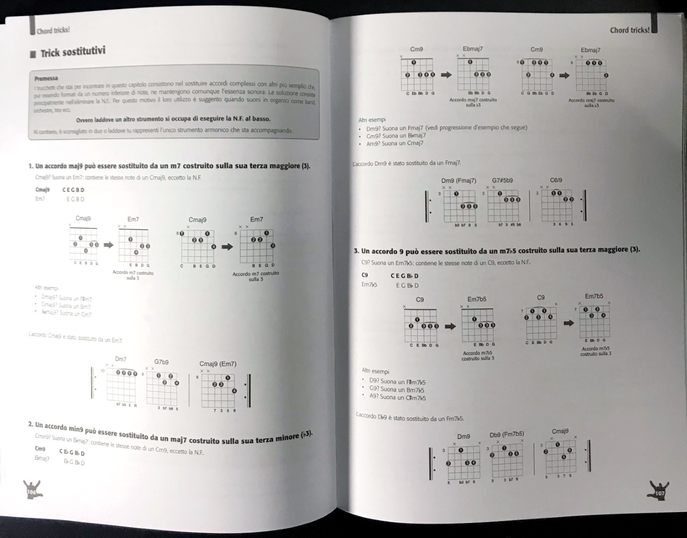 Tornando al manuale in questione, dopo un intero capitolo su come e quali “gradi” escludere da un accordo, troviamo un Prontuario di ben 123 pagine di accordi, triadi, slash chords, policordi e magic chords, una sezione davvero utilissima che può essere utilizzata anche dall’insegnante e dal docente, di pronto uso per una consultazione rapida, o efficace per uno studio molto approfondito degli accordi, ottimamente visualizzati con tutte le variazioni e alterazioni armoniche.