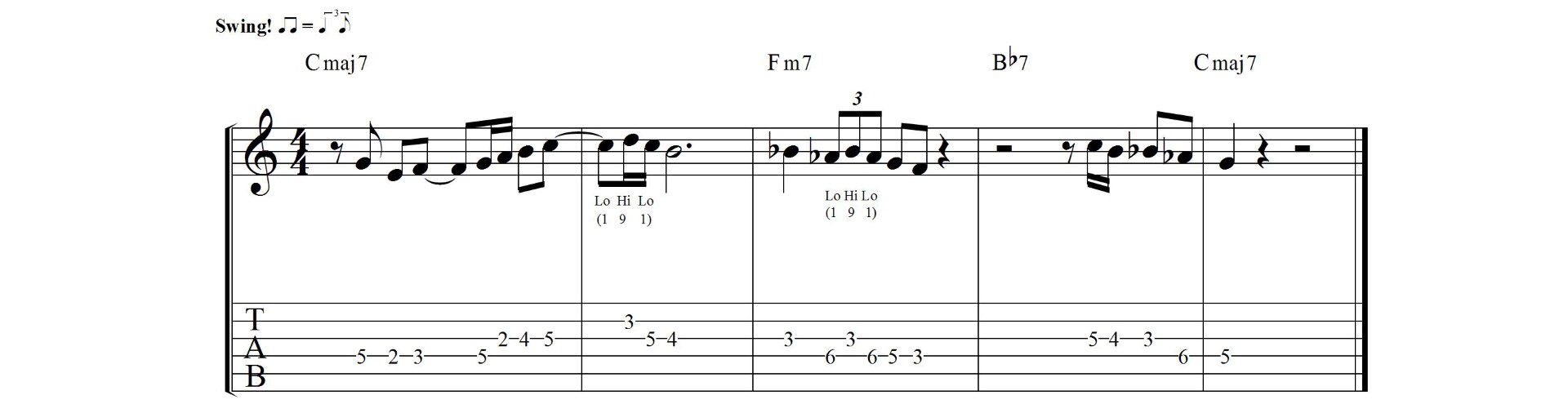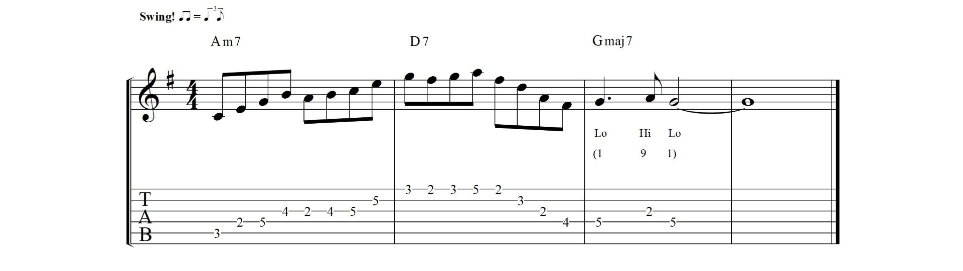 A questo punto è facile dedurre che la prima variazione delle Hi-Lo si ha quando una nota dell’arpeggio (nota cordale) sale di grado per poi tornare, dopo aver creato una momentanea tensione, nella posizione iniziale.