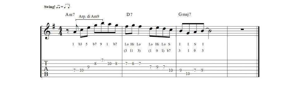 Facendo l’analisi melodica nella prima misura con in sigla Am7 il la, nota dell’arpeggio (I), sale di grado verso il si (9), per poi ritornare alla nota fondamentale sol.