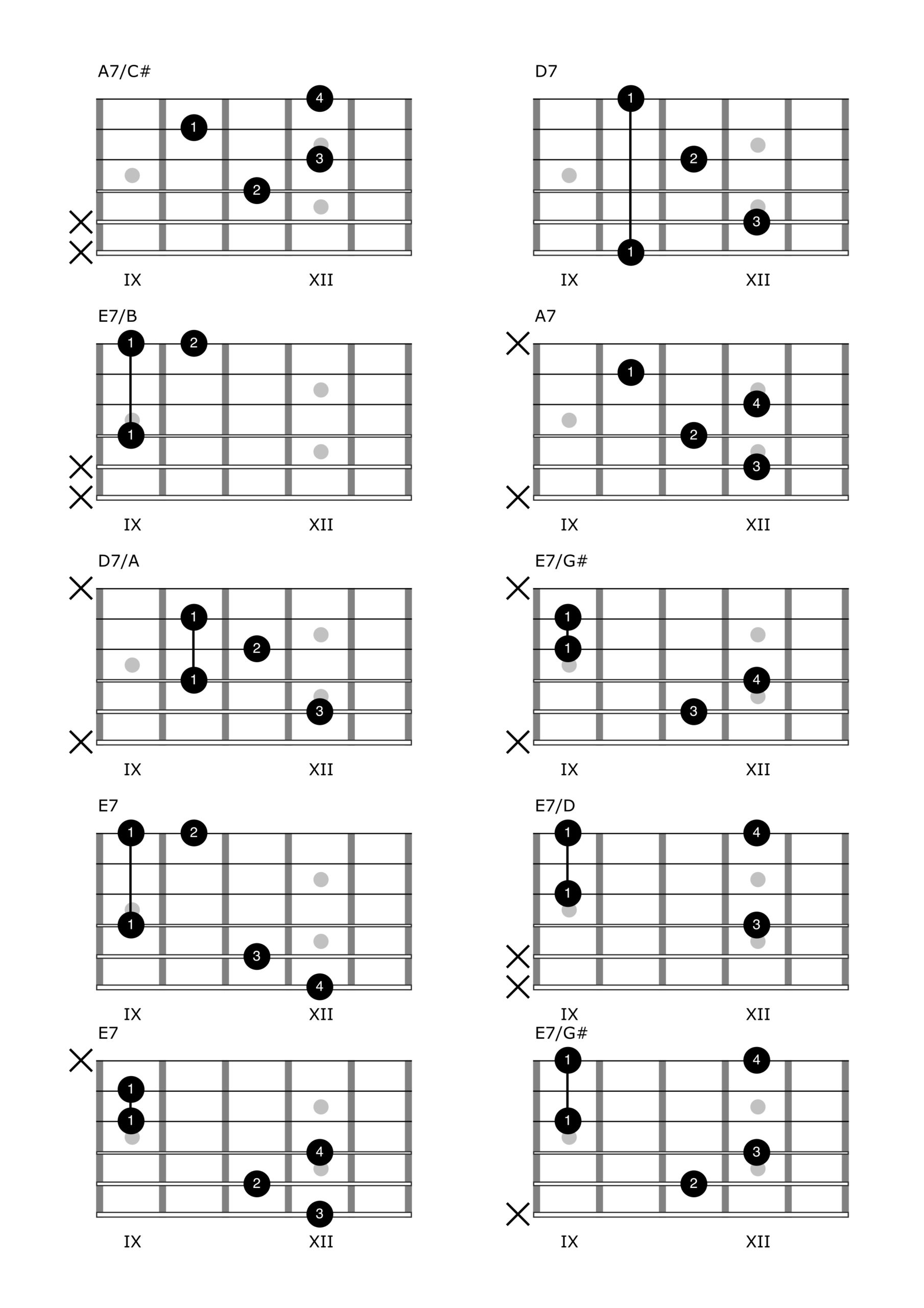 Nel prospetto che segue ho inserito diverse soluzioni di voicing per l’accompagnamento con accordi, questi voicing sono presi dalle posizioni del CAGED e sviluppano la progressione armonica su tutta la tastiera della chitarra.