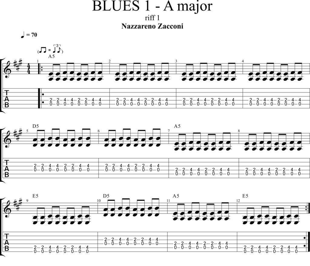 L’accompagnamento ritmico del blues è caratterizzato da “Riff” davvero tipici di questo stile che si muovono intorno a power chord arricchiti da sesta e settima, con piccole frasi sul passaggio da terza minore a terza maggior.