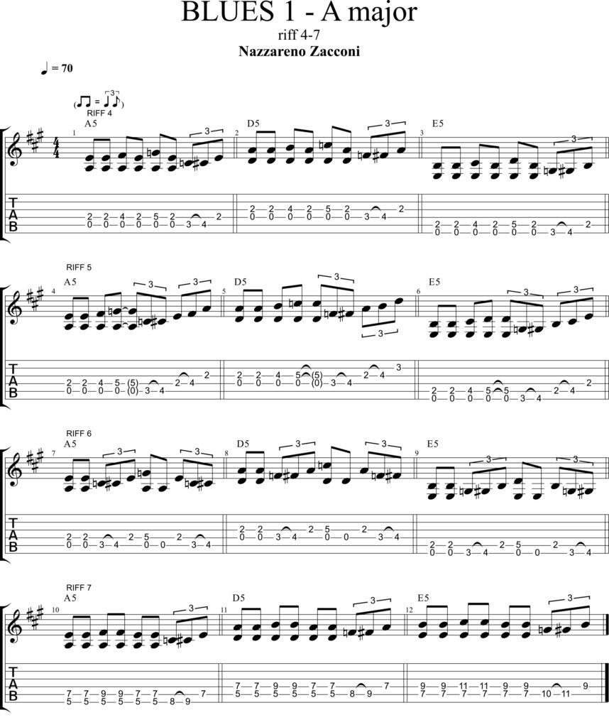 Negli esempi 4, 5 e 6 vengono mescolati insieme gli elementi visti prima, ma per praticità sono stati trascritti solo i riff per singolo accordo e non tutta la stesura giro da 12 battute.
