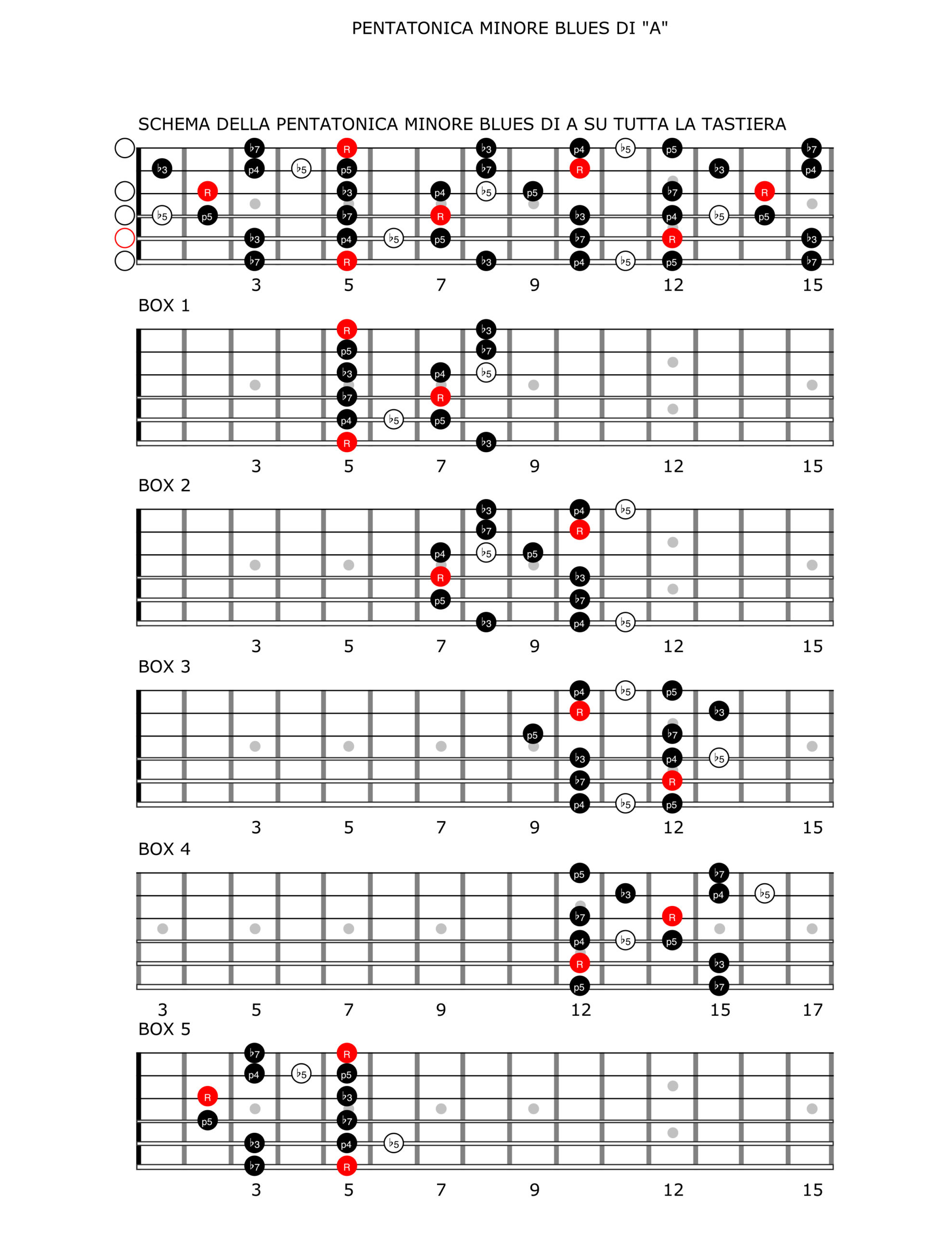 Oltre alla Pentatonica minore, possiamo utilizzare anche la scala Pentatonica Blues, che non è altro che una pentatonica minore con in più la “Blue Note”(quinta bemolle).