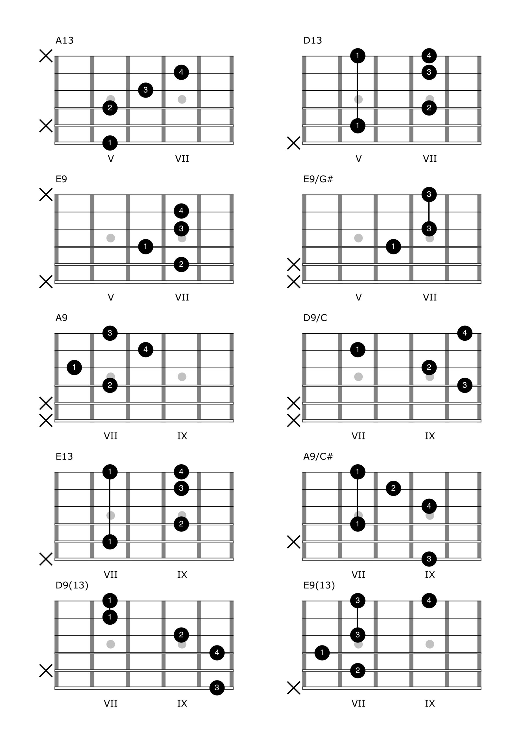 Detto questo vediamo come modificare i voicing che avevamo visto nella lezione precedente per aggiungere la nona e la tredicesima nel nostro esempio di Blues in A.