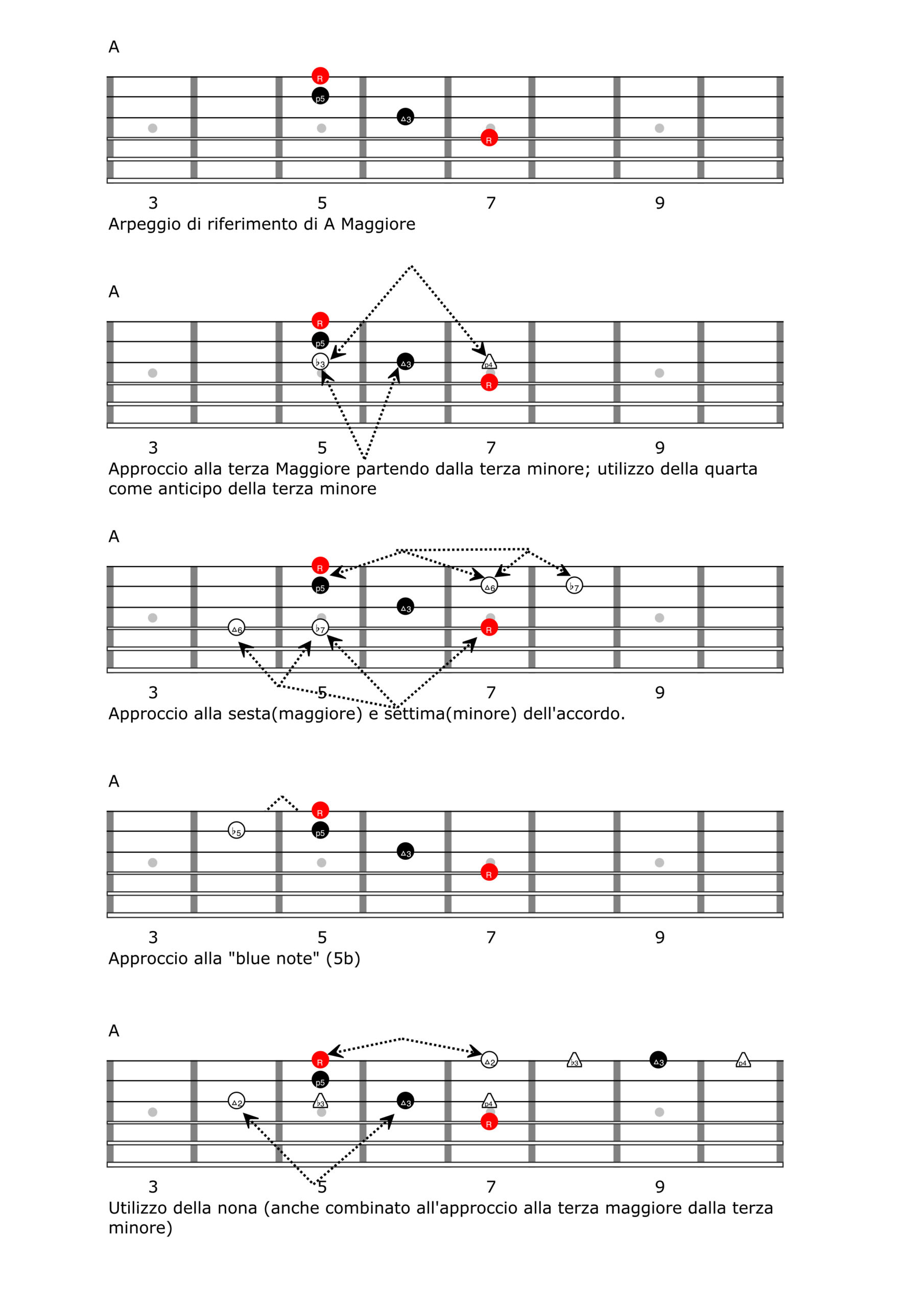 Tornando al nostro Blues in A, ho realizzato dei grafici sulle triadi di A, D e E,che possano aiutare lo studio di questi approcci ai vari gradi, tenendo conto quanto segue: