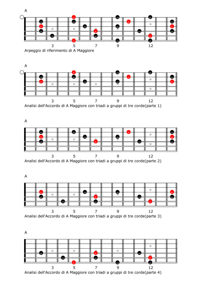 Per aiutare nell’analisi di questi elementi sulle triadi del Blues in A che stiamo analizzando, ho realizzato degli schemi per “mappare” le triadi a gruppi di tre, quattro, cinque e sei corde, in modo da sviluppare questi fraseggi su tutta la tastiera della chitarra.
