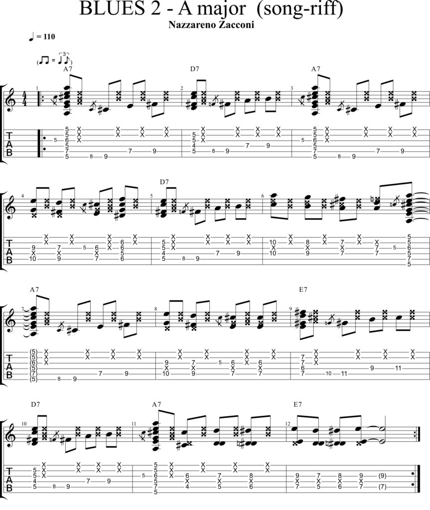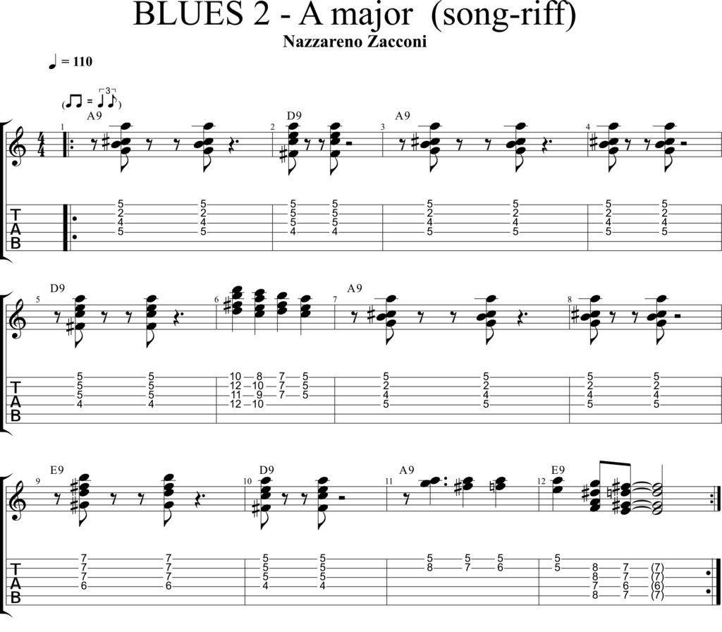 Espandendo questi concetti agli altri accordi della progressione armonica del Blues in A, potremo trovare delle soluzioni molto interessanti per arricchire l’esecuzione ritmica, tipo suonare sopra al A9 dei movimenti tra F#m e Em, oppure sopra al D9 dei movimenti tra Bm e Am come ho fatto nell’accompagnamento con la chitarra clean dell’esempio audio (vedi figura sotto).