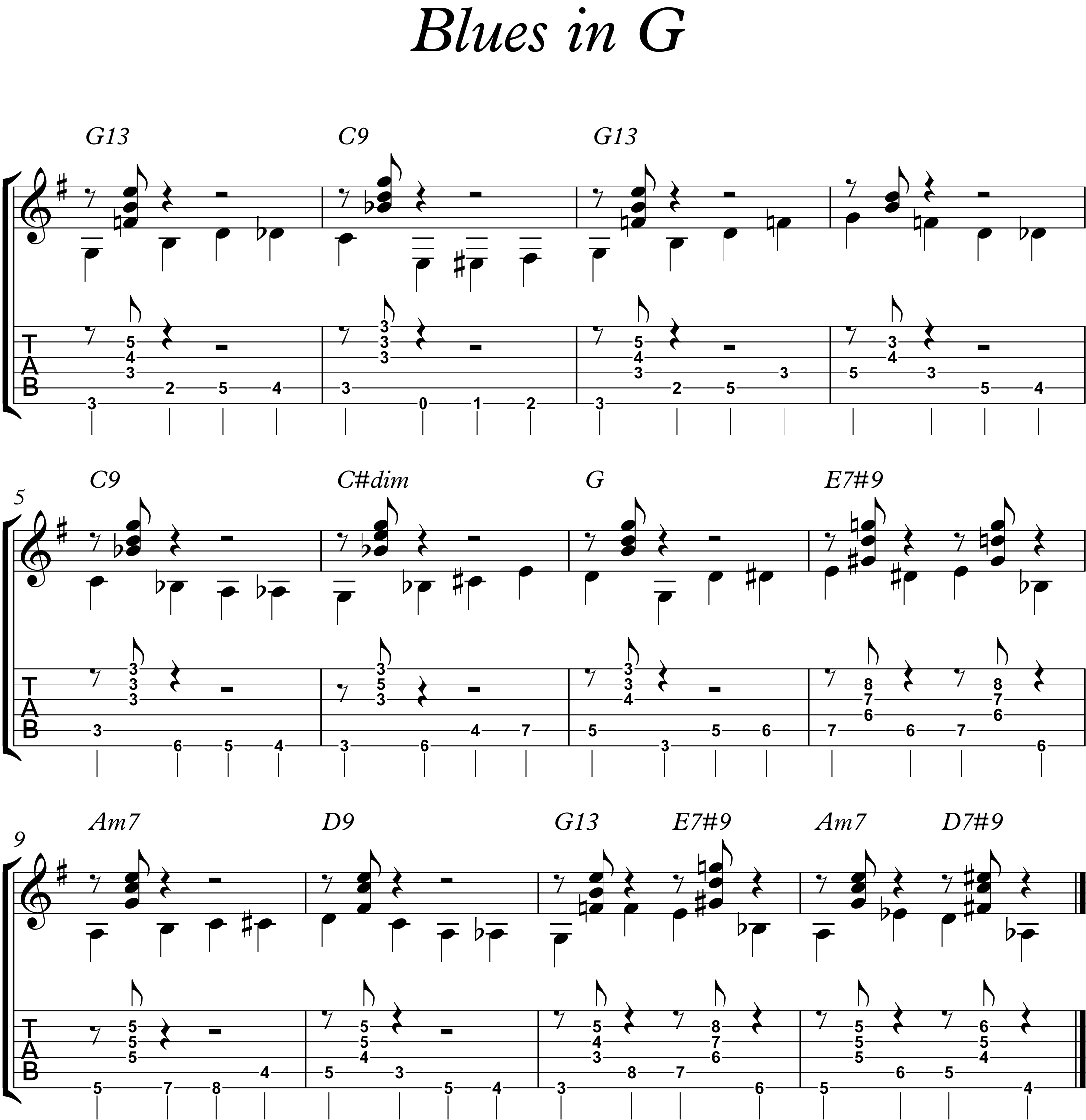 Prenderemo in considerazione un blues di 12 battute nella tonalità di G in quanto è una tra le più adatte al nostro strumento e al nostro intento didattico (generalmente gli strumenti a fiato prediligono le tonalità di F, Bb, Eb).