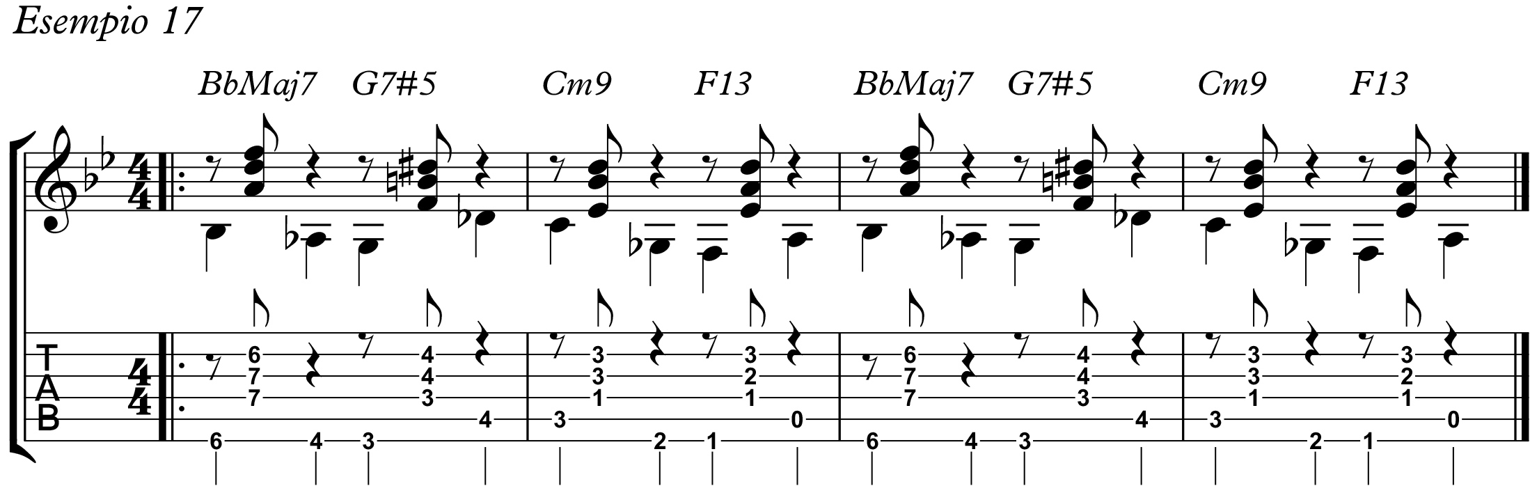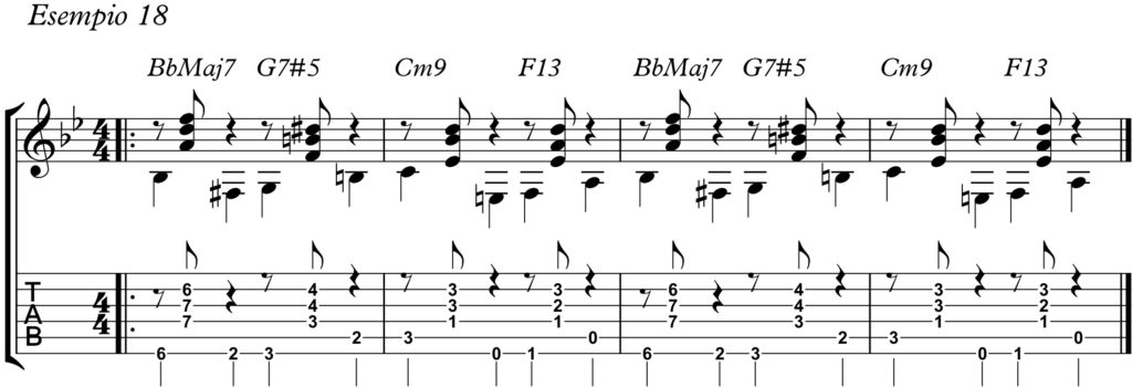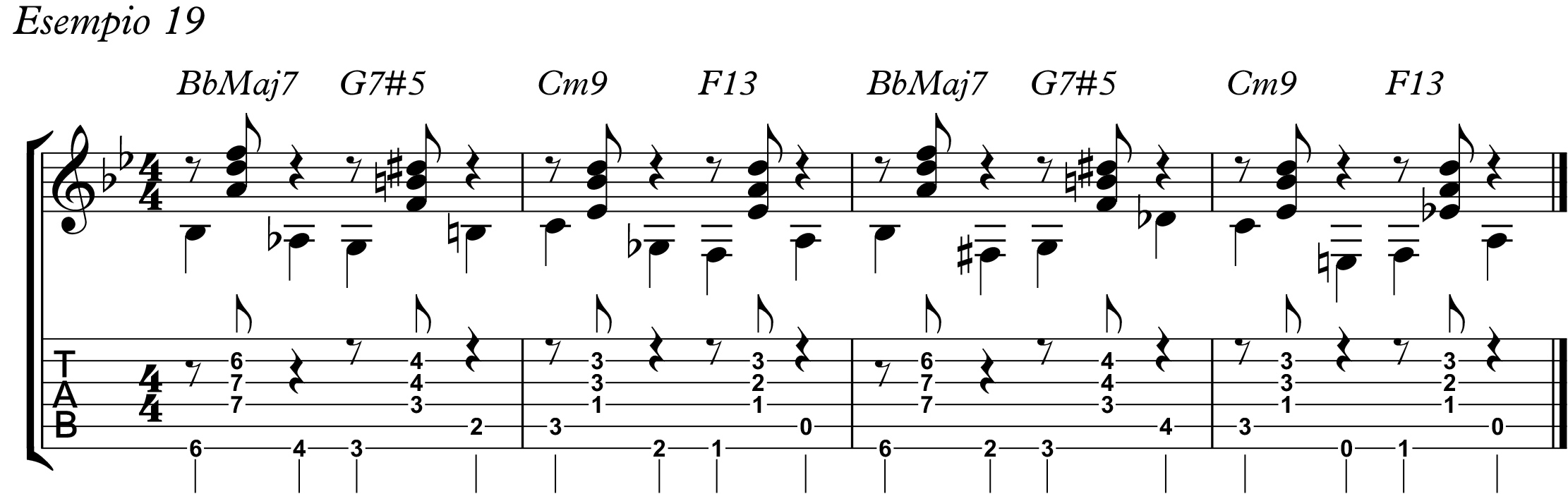 Pertanto, negli esempi che vi propongo, ne ho riportato una tra le tante che si possono riscontrare: BbMaj7, G7#5, Cm9, F13.