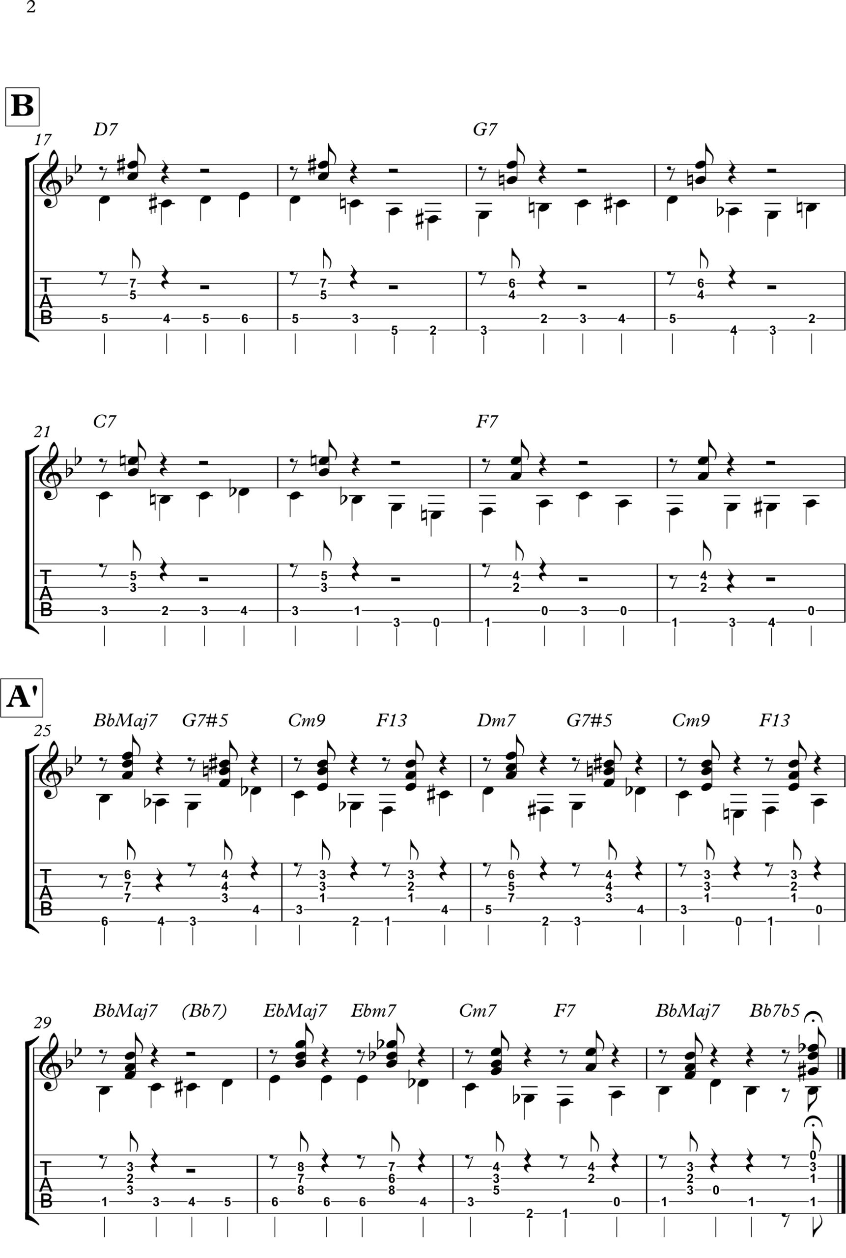 - Nella sezione A’ abbiamo un semplice II-V-I che conclude con un cromatismo discendente che ci introduce al primo accordo della sezione B.