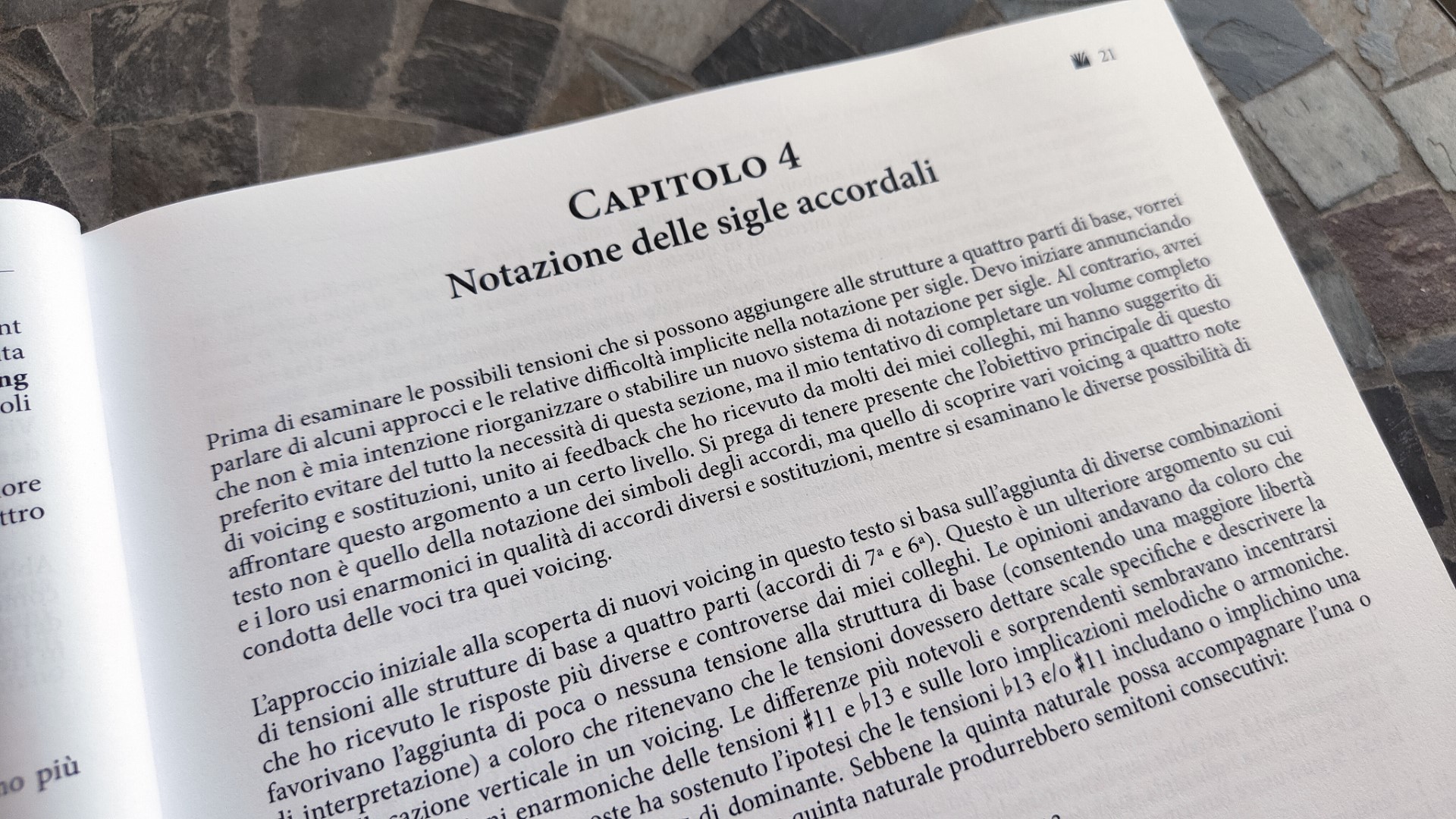 Si inizia quindi dal primo capitolo con i voicing in drop 2 per poi passare sezione dopo sezione alle tensioni, alle sostituzioni enarmoniche, a quelle simmetriche di dominante, alle dominanti alterate, fino ai voicing per gli slash chord. E tante altre informazioni in mezzo a queste, ovviamente.