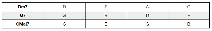 Prendiamo in considerazione la ben nota progressione IIm7, V7, IMaj7 (che contiene tre delle specie armoniche più comuni, utilizzate e onnipresenti). Potenzialmente, tutte le note della scala che hanno generato gli accordi stessi, possono essere utilizzate durante un’improvvisazione per suonare melodicamente sopra alla progressione.