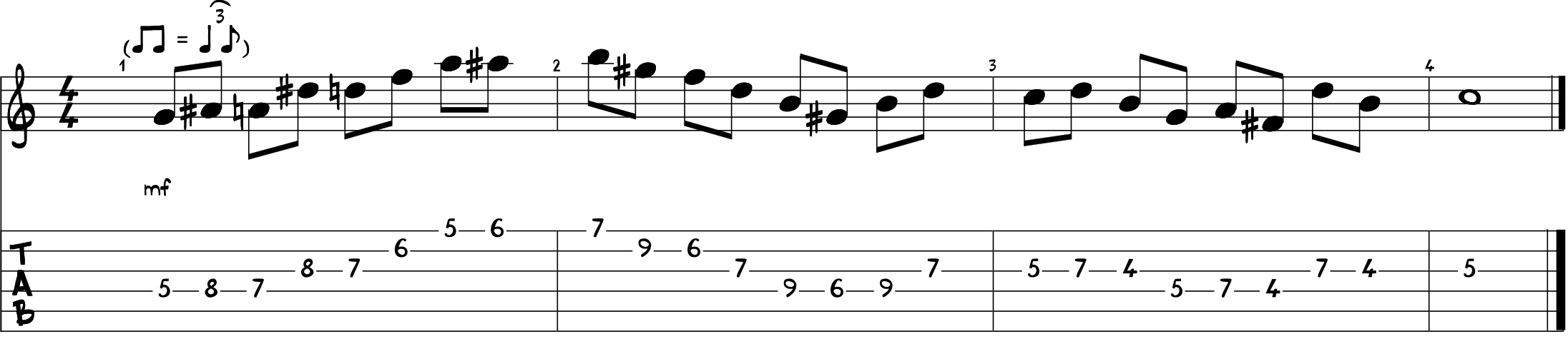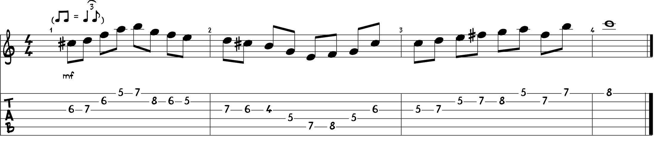 Ora che abbiamo tracciato la mappa degli accordi attraverso la scala, possiamo prendere in considerazione un fraseggio melodico che si appoggia totalmente all’armonia e sarà quindi costituito prevalentemente dalle note degli arpeggi come il prossimo esempio.