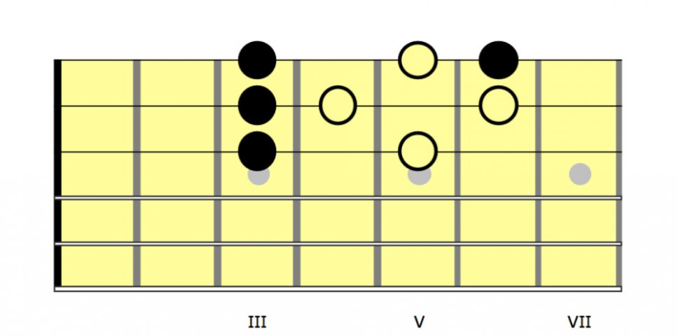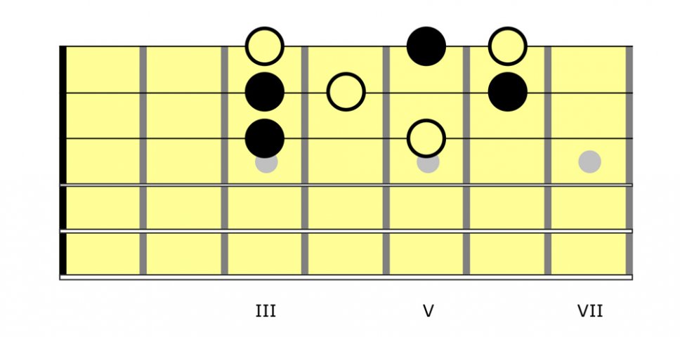 Questa pratica di separare l’uso della scala da quello dell’arpeggio, permette di colorare e contestualizzare scale differenti alla stessa forma di accordo.