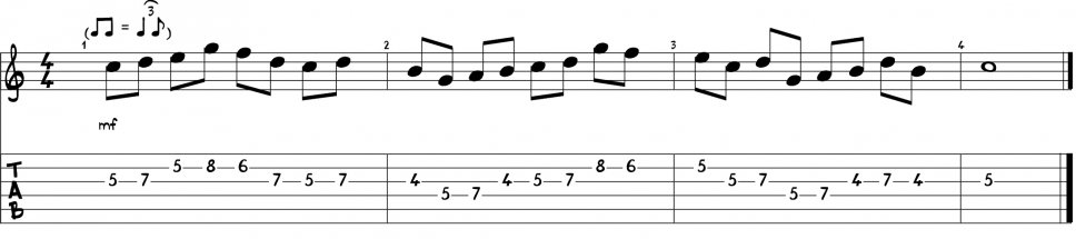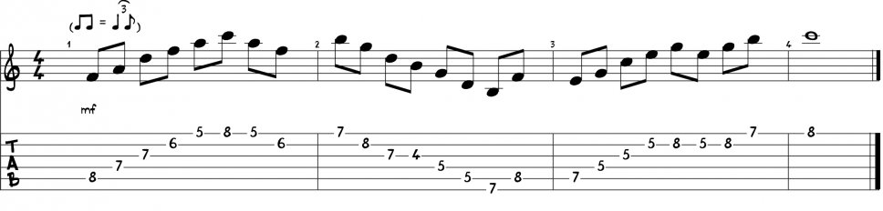 Ora che abbiamo tracciato la mappa degli accordi attraverso la scala, possiamo prendere in considerazione un fraseggio melodico che si appoggia totalmente all’armonia e sarà quindi costituito prevalentemente dalle note degli arpeggi come il prossimo esempio.