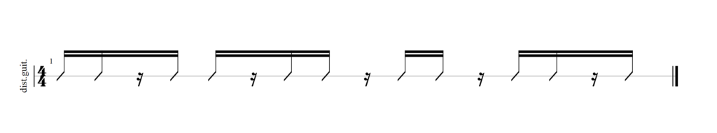 Provo a improvvisare ostinando 2 note e 1 pausa. Non importa quali note, l’unica accortezza, per ora, è che sia le note che la pausa siano lunghe uguali, in questo caso userò i sedicesimi (semicrome). Di seguito la chart per capire meglio e l’audio.