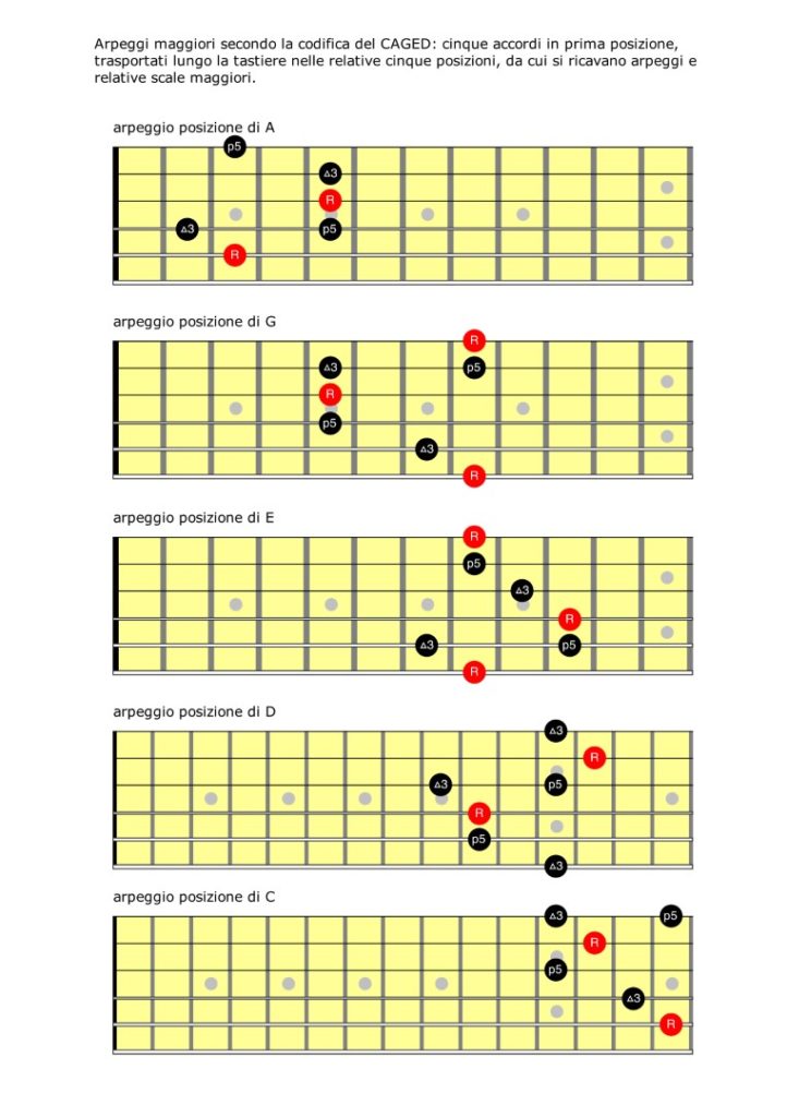 Per poter decodificare la tastiera adotteremo il sistema CAGED, acronimo in notazione anglosassone di cinque accordi maggiori presenti in prima posizione in forma maggiore (do, la, sol, mi, re), che si possono facilmente trasportare sul manico, facendo corrispondere cinque zone in cui avremo sempre l’accordo di C maggiore.