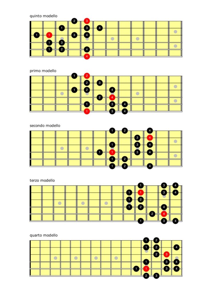 Quindi in questo primo “allenamento”, propongo di cominciare dalle basi e per essere sicuri di poter uniformare tutti quanti, memorizziamo i cinque modelli di pentatoniche, praticandoli a metronomo con portamento in duine di ottavi, poi in terzine e infine in quartine di sedicesimi.