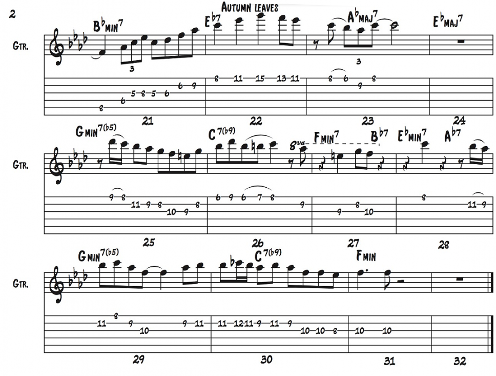 A misura 25, una nuova ed interessantissima frase sul II-V minore. Anche in questo caso troviamo l’utilizzo della scala minore armonica di F e dell’arpeggio dell’accordo diminuito costruito un semitono sopra il V grado, in modo da avere ancora una volta i suoni della nona e tredicesima bemolle del dominante.