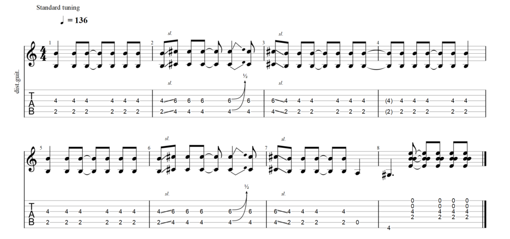 Come puoi sentire all’inizio del pezzo a 0:30 secondi del video sopra riportato, il riff introduttivo esegue una melodia che il chitarrista rinforza doppiando ogni nota con la sua ottava.