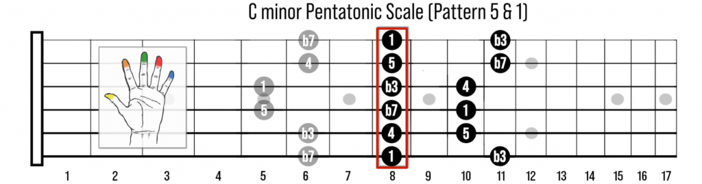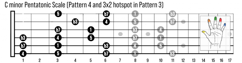 Stessa area del manico, stesso tipo di scala, ma fisicamente posizionata dall’altro lato della tonica. Il risultato è che il chitarrista ha la pentatonica minore disponibile sia sopra che sotto l’equatore, coprendo una zona del manico che di solito veniva saltata o ignorata.