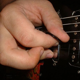 Analizziamo alcune fotografie che ci permetteranno di capire al meglio come risolvere questi problemi.Cliccate sulla fotografia per ingrandirla E’ chiaramente visibile che il muting viene effettuato con il plettro che poggia sulla corda sovrastante a quella suonata e con le dita che stoppano le corde sottostanti a quella suonata.