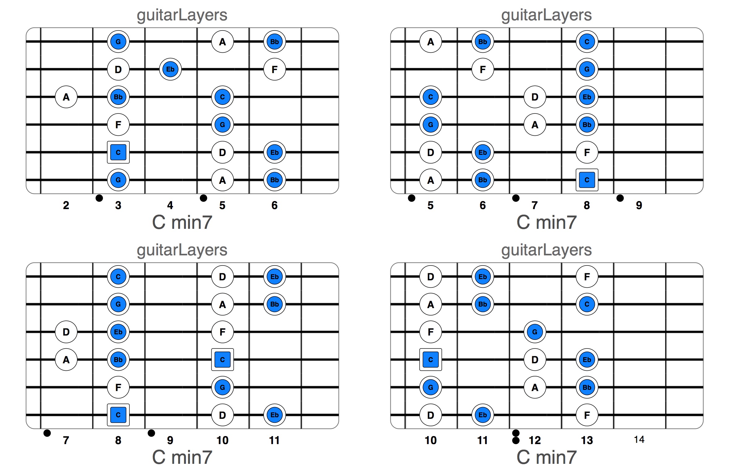 In maniera analoga è possibile operare con gli arpeggi per creare automaticamente diagrammi che permettono di visualizzare i chord-tones a cui fare riferimento quando si vuole suonare una scala e dare il giusto peso alle note dell’accordo.