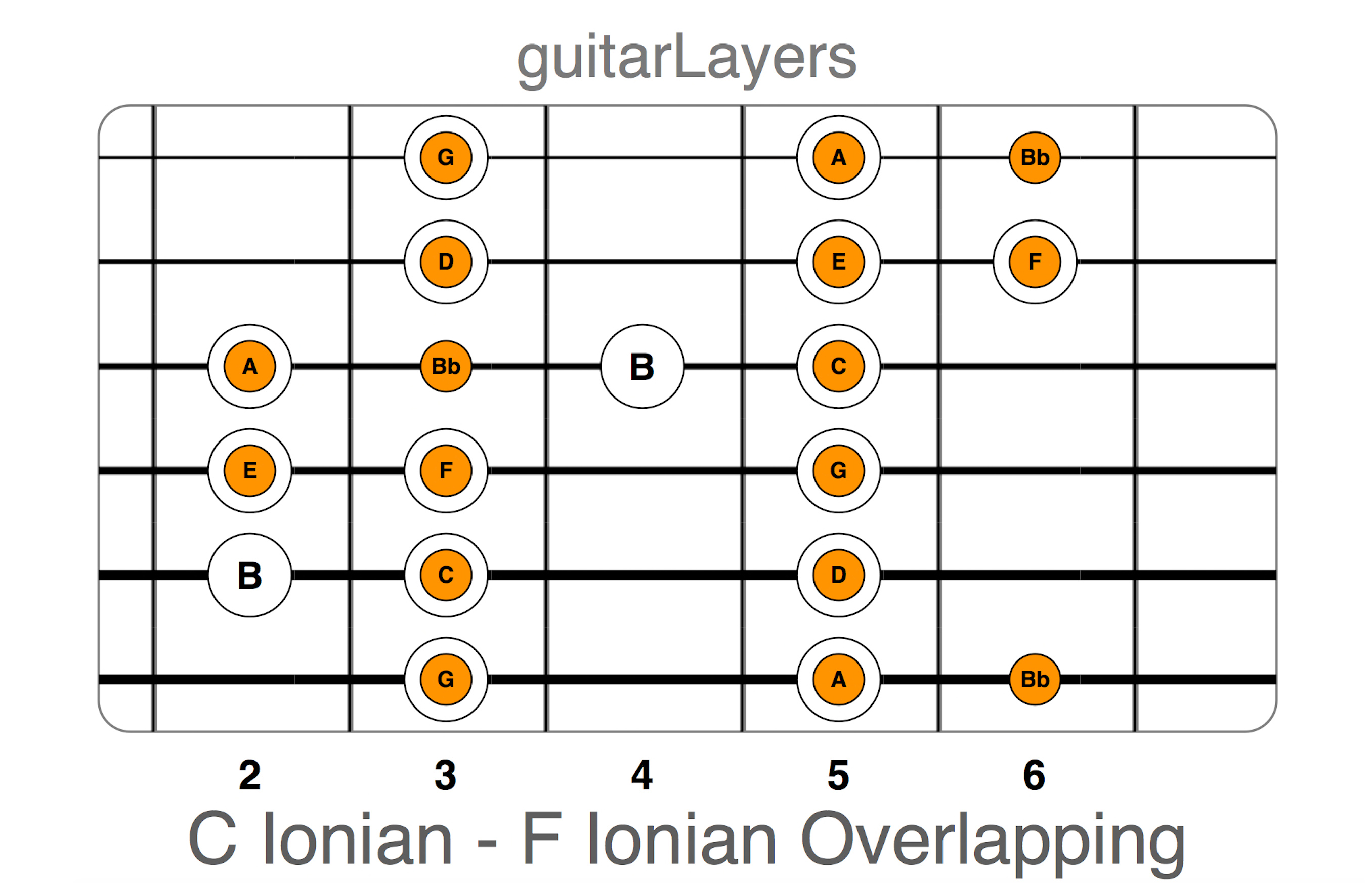 La figura seguente mostra le due scale (C maggiore bianca, F maggiore arancione) sovrapposte con guitarLayers su una stessa porzione di tastiera e rende evidente quale nota cambia e quali note siano in comune tra le due succitate scale, rendendo visuale sul manico quello che ci era chiaro solo in teoria.