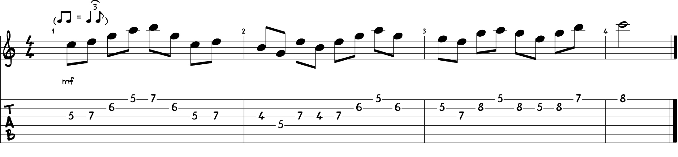 La prima esercitazione che propongo è attraverso l’uso della scala maggiore di C, con cui attraversare questa progressione. L’indicazione è quella di fraseggiare a duine di ottavi, cercando di collegare il Dm7 al G7 e quest’ultimo al CMaj7, attraverso le note guida, cioè il III e VII grado.