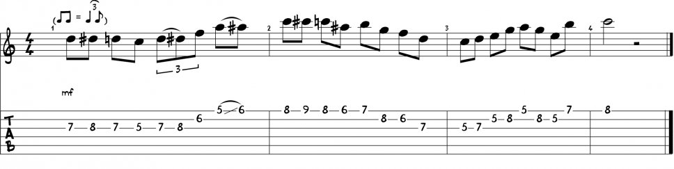 In quest’ultimo esempio, vediamo come sul Dm7 possiamo applicare la minore armonica (attenzione alla discrepanza del settimo grado minore nell’accordo e maggiore nella scala); mentre sull’accordo di dominante (G7) applicheremo il sound esatonale o eccedente, attraverso un semplice arpeggio che altera il quinto grado (D > D#).