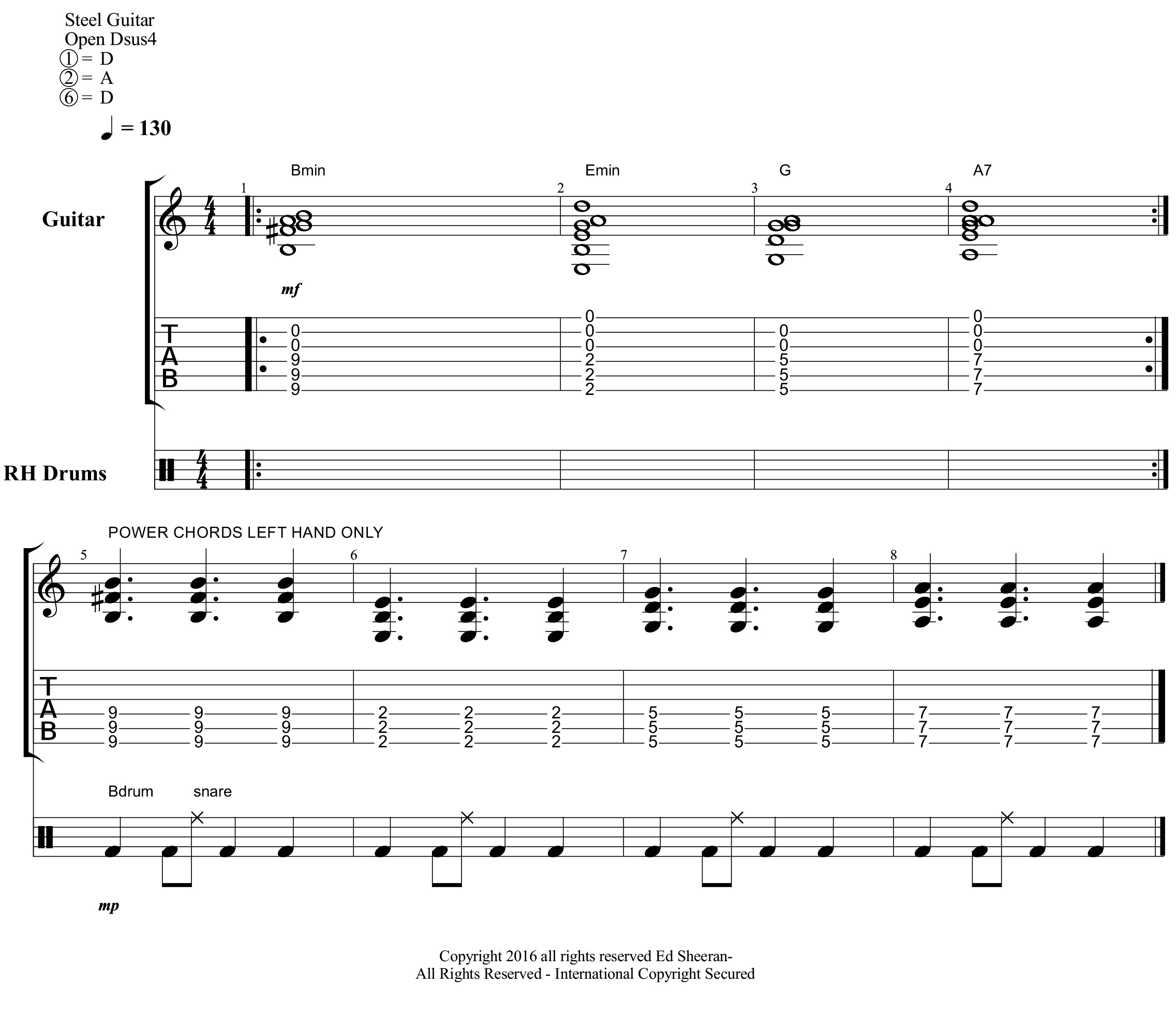 Il brano nella video lezione segue gli accordi Bm, Em, Gmaj e Amaj. L’accordatura è DADgad e questo ci consentirà di usare i power chords sulle tre corde basse come guida armonica.