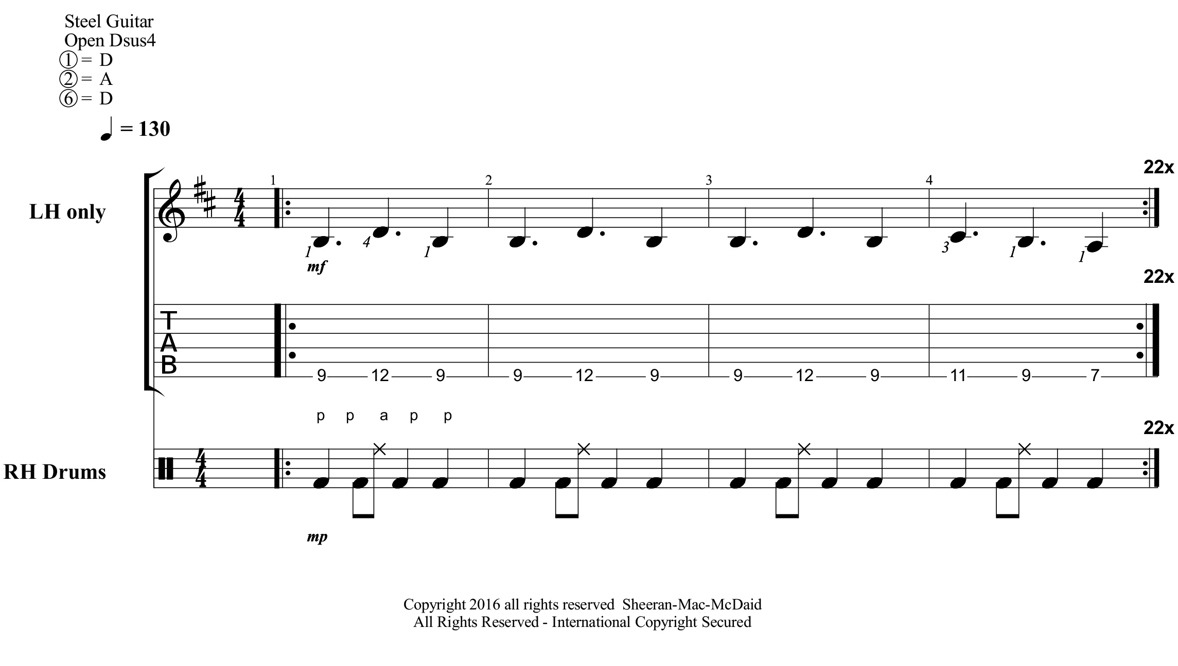 In DADgad uso i bassi dell’accompagnamento originale (che suona anche come un riconoscibilissimo riff della canzone) suonandoli con la sola mano sinistra e poi con la mano destra; sovrappongo un piccolo accompagnamento percussivo usando solo due suoni, uno scuro (pollice sul ponte/nodo delle corde basse) e un suono chiaro tipo rullante (anulare che percuote il top sottostante).