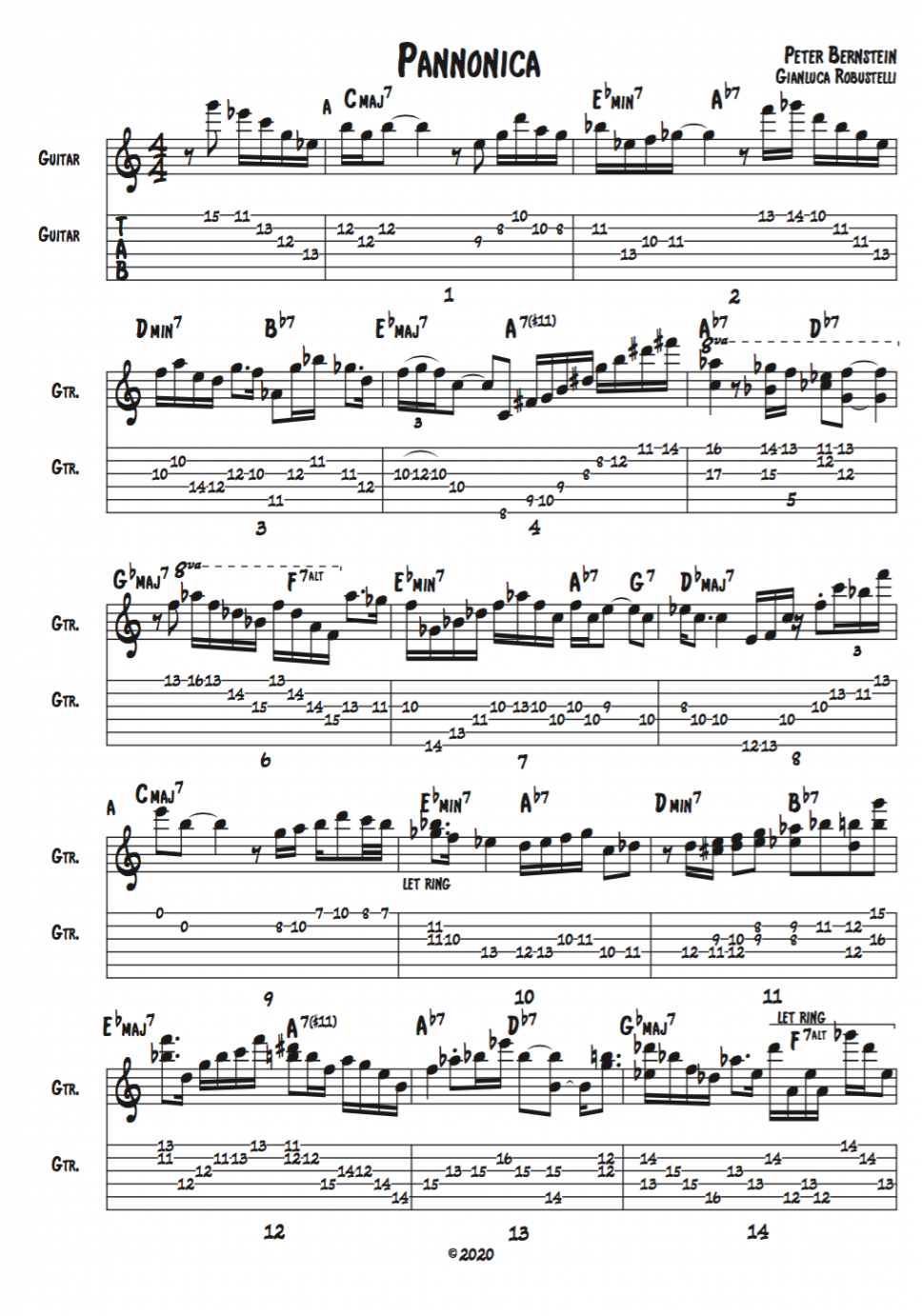 La misura 15 chiude questo discorso musicale, iniziando con un accordo di Ebmin7(9) che afferma l’armonia, seguito da una frase che parte in sedicesimi per poi finire a crome seguendo gli accordi terminando su Dbmaj7, anche qui con una risoluzione ritardata, dove vengono suonate la nona e la settima maggiore dell’accordo, invece di una nota più stabile magari della triade, a dimostrazione di come Peter Bernstein metta al centro del discorso musicale la melodia e il suo sviluppo.