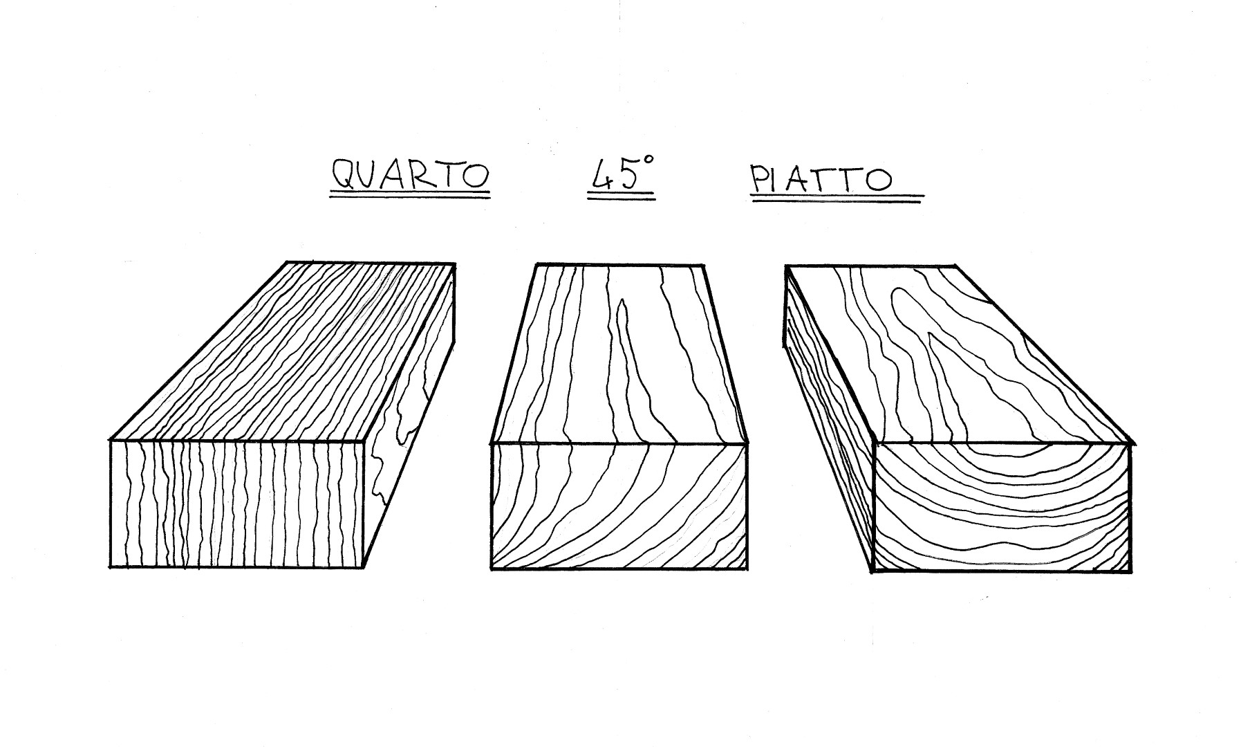 Ma, a parte la stagionatura, un’indicazione per valutare la qualità di un manico, e di tutto lo strumento in generale, è il tipo di taglio. Da un tronco si possono ricavare tre tipi di taglio: taglio di quarto (quarter sawn), a 45° (rift sawn) e taglio di piatto (flat sawn)