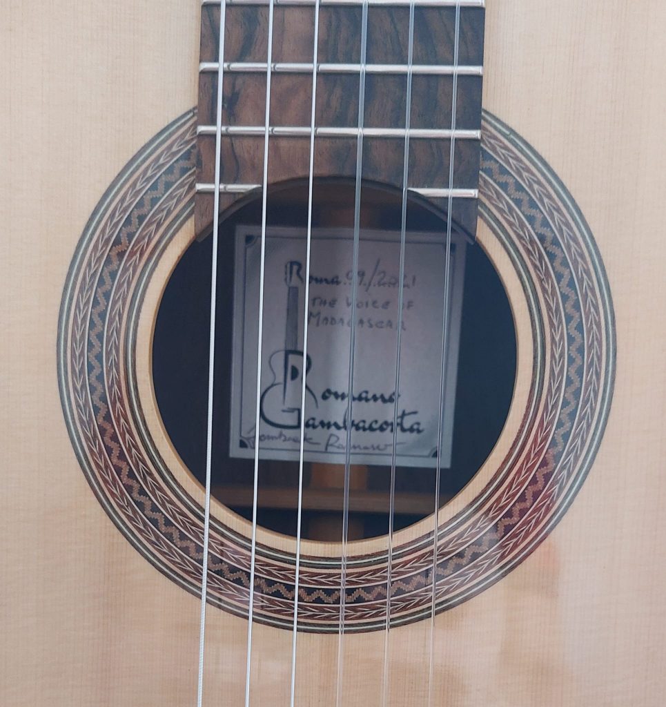 Ho un’altra chitarra che amo molto: quella dedicata a Roma, commissionata dal compositore e jazzista Claudio Aghiello. La rosetta, vista dall’alto, riproduce le liste del Colosseo; sulla paletta è incisa l’aquila romana; i legni richiamano le mura antiche della città. Sono un romano di Roma, e quella chitarra lo dice senza equivoci.