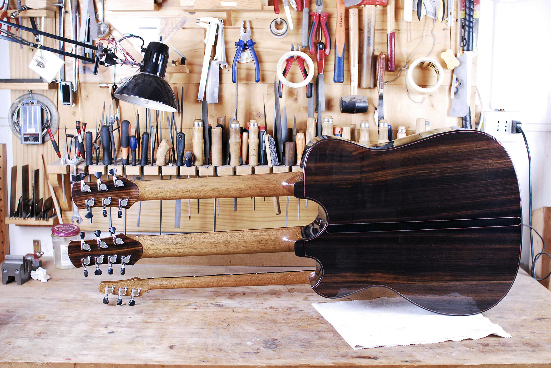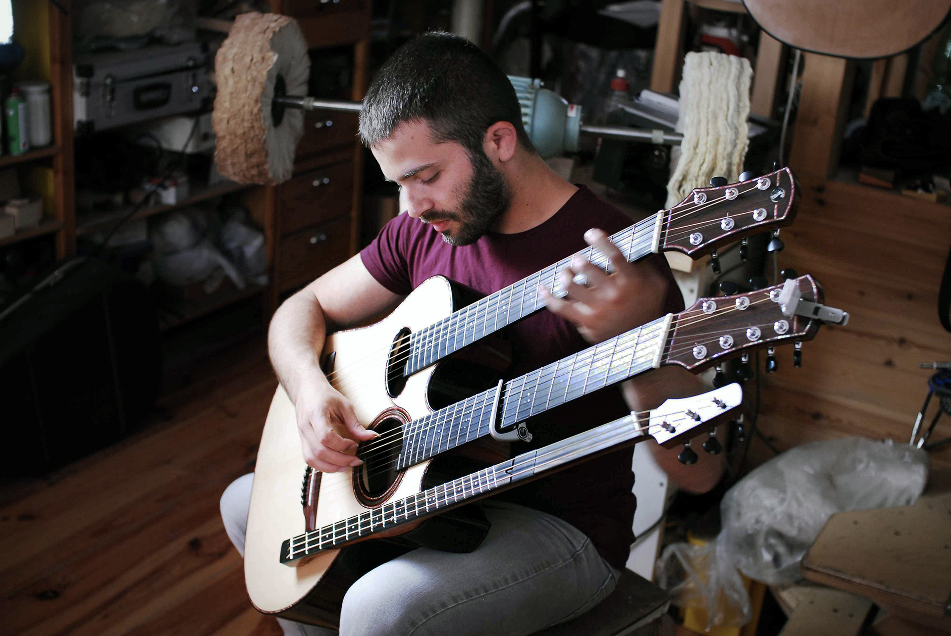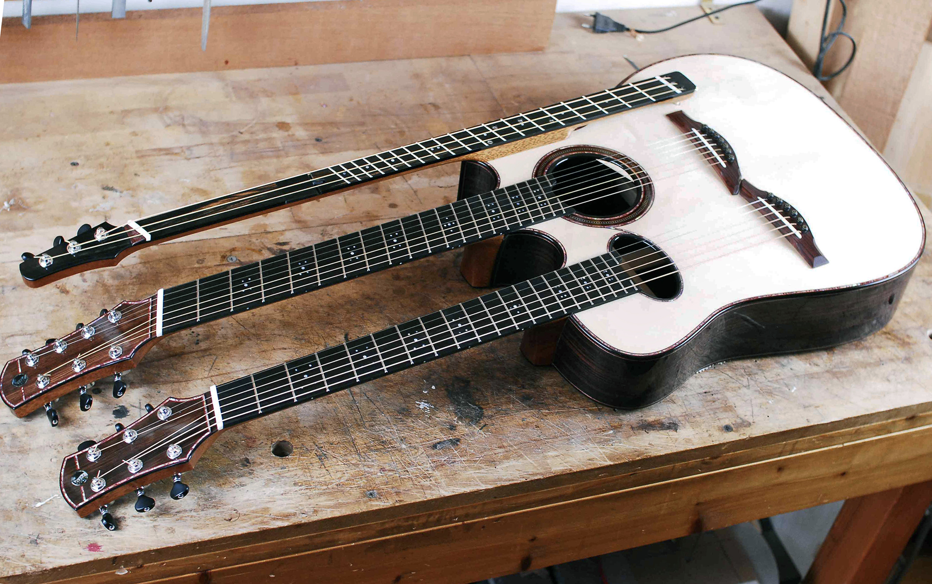 Il primo è la triplo manico realizzata per e con Luca Stricagnoli, ormai famosa in tutto il mondo. Posso vantare anche diversi tentativi di copia da parte di alcuni liutai cinesi. Non è la prima chitarra acustica con tre manici nella storia della liuteria, ma ha caratteristiche inedite adattate al modo unico che ha Luca di suonare: è in grado di comporre l’arrangiamento di un pezzo con 4 parti come 4 strumenti diversi contemporaneamente.
