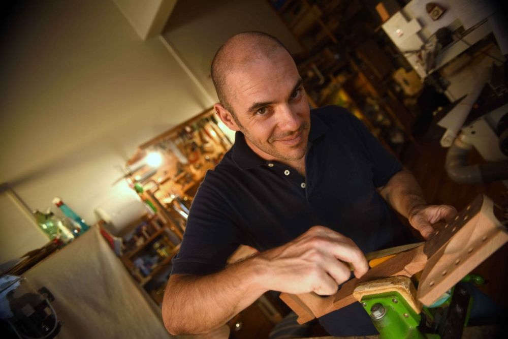 A 22 anni studiavo ingegneria meccanica a Tor Vergata. Un giorno portai la mia chitarra da riparare e rimasi folgorato: l’ambiente, gli utensili, il profumo del legno, l’idea stessa di costruire uno strumento. Sin da bambino adoravo costruire, dai Lego fino al legno vero e proprio. Da quel momento ho cercato una strada per imparare la liuteria, ma non è facile: è una materia poco diffusa. Continuai a studiare ingegneria per altri tre anni, finché scoprii l’esistenza della Scuola Civica di Liuteria di Milano. Pochi mesi dopo ero già lì iscritto. È stata un’esperienza stupenda: gli insegnanti, i corsi, i compagni, tutto era perfetto. Non mi sono mai pentito di aver lasciato l’università.