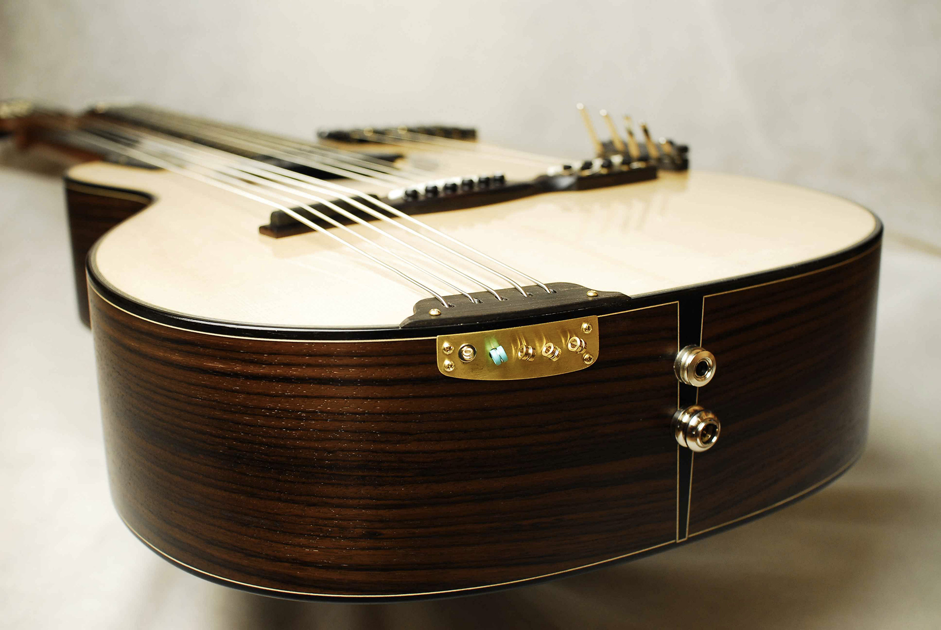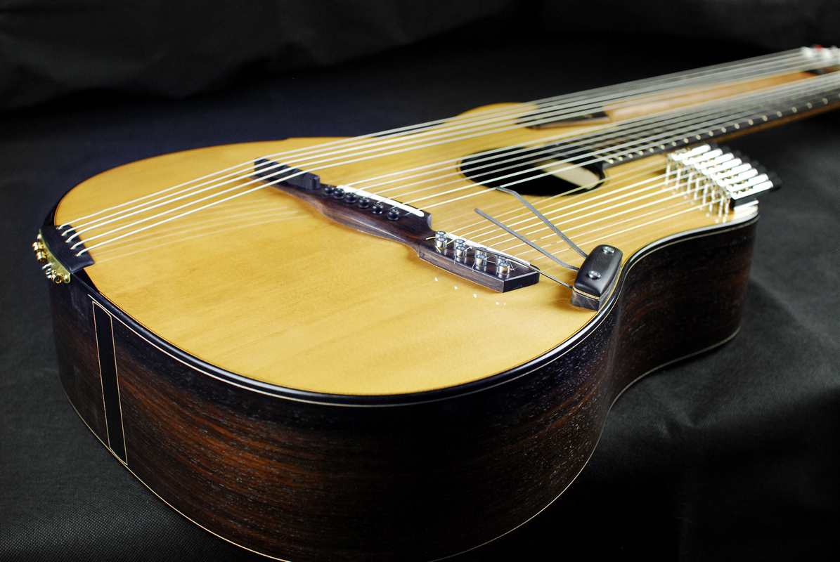 Oltre a queste due porterò una classica con tavola armonica in abete double top costruita con legni di derivazione esclusivamente europea: abete, acero, pero. A seguire una classica con tavola armonica in abete e fondo e fasce in blackwood con un progetto moderno di incatenatura ad “X” derivata dal design tipico delle chitarre acustiche.