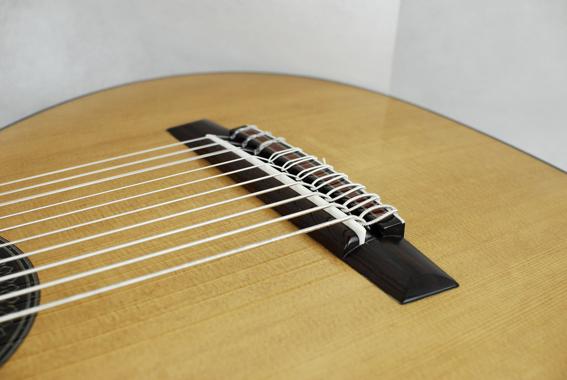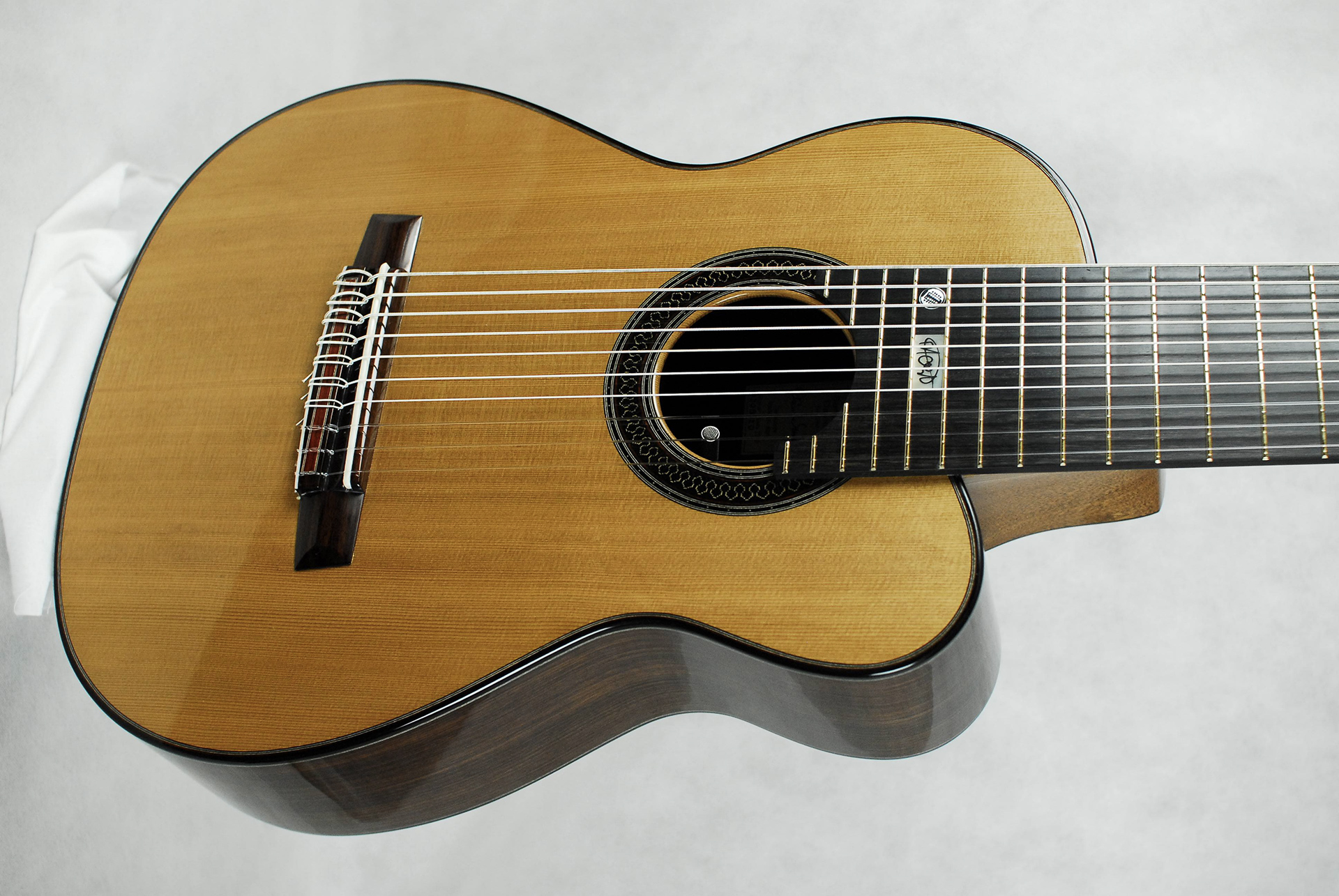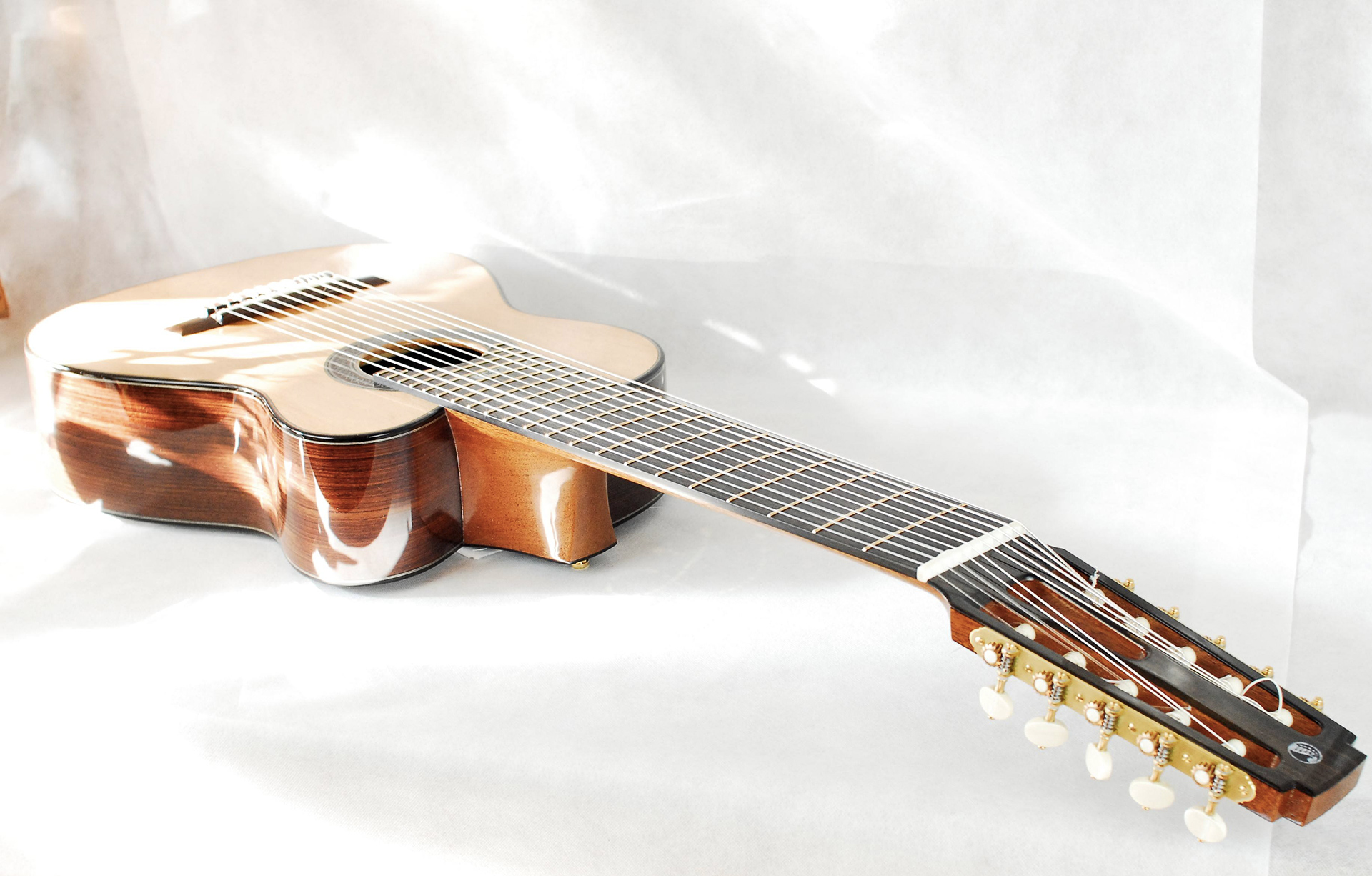 Il terzo strumento è una chitarra classica a 10 corde costruita per Marina Krupkina, un talento eccezionale. Ha una tavola armonica in cedro con incatenatura presa da Daniel Friederich. Ho pensato fosse il progetto di incatenatura perfetto per poter gestire l’enorme energia data dalle dieci corde.