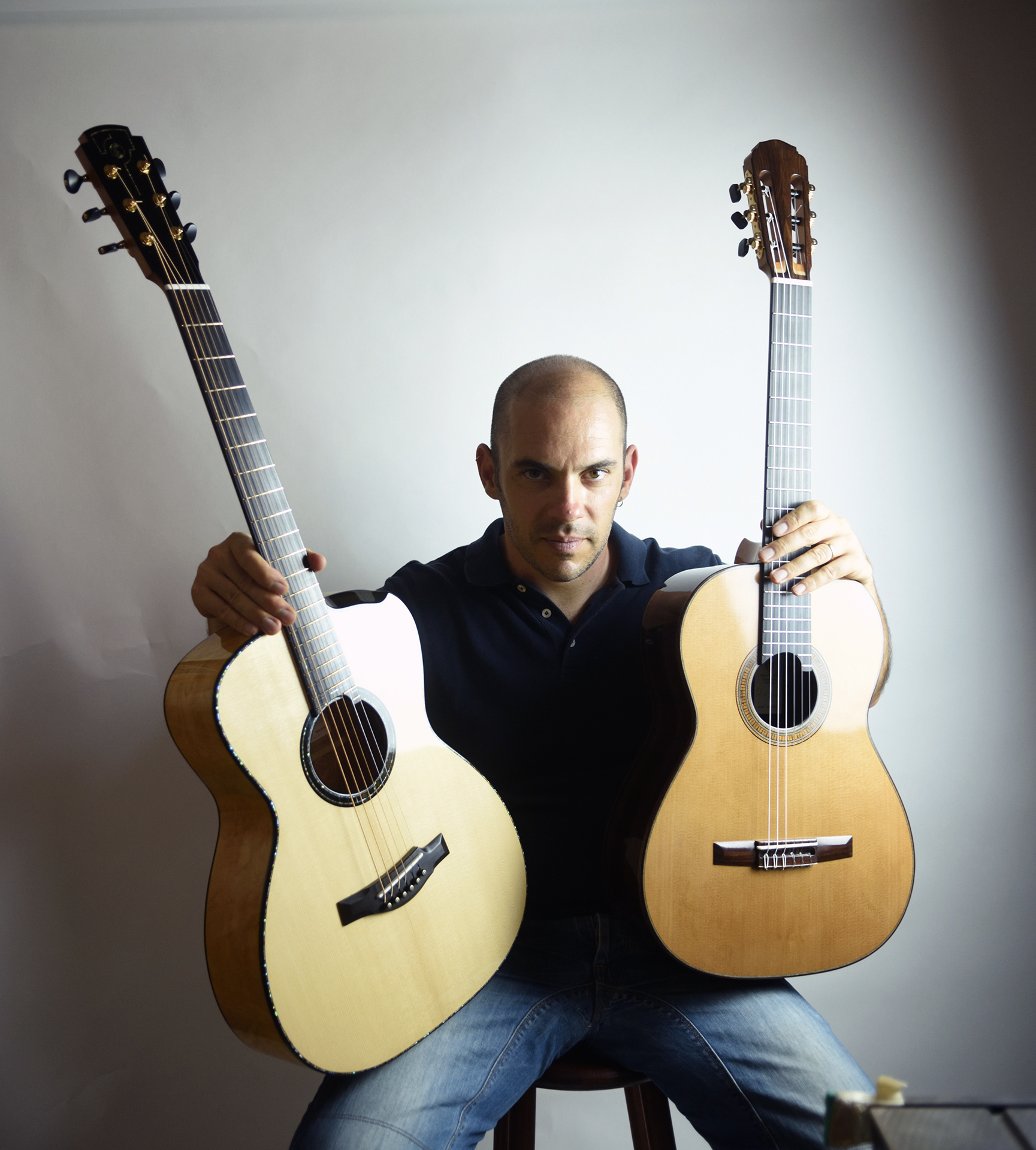 Davide Serracini è uno di quei liutai che non si accontenta di replicare modelli collaudati. Il suo laboratorio è un crocevia tra tradizione e sperimentazione, dove chitarre a triplo manico convivono con eleganti decacorde e progetti che riscrivono le regole dell’acustica.